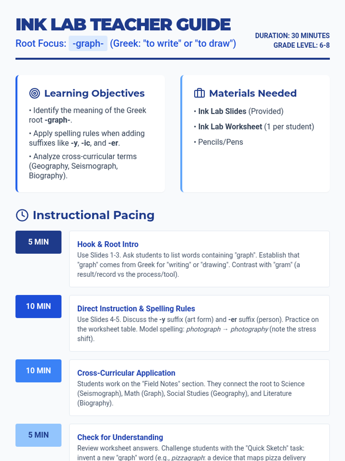 A 30-minute lesson plan for middle school teachers focusing on the morpheme '-graph-', including pacing, objectives, and common misconceptions.
