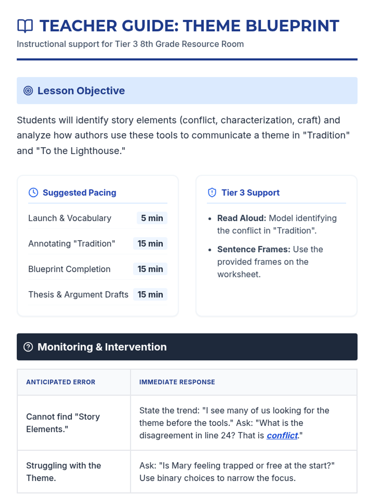 A teacher's facilitation guide for the Theme Blueprint lesson, providing pacing, tier 3 scaffolding strategies, and a detailed intervention table for monitoring student progress.