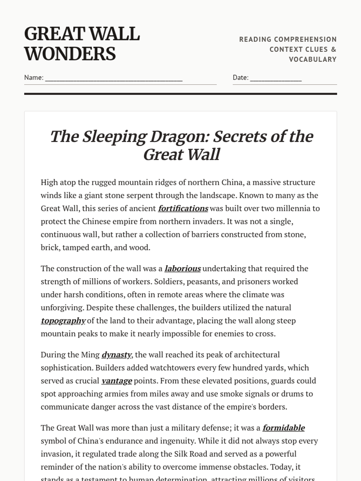 An EOG-style reading passage about the Great Wall of China, featuring a historical informational text and multiple-choice questions focusing on context clues and vocabulary. Revised for better layout and added content.