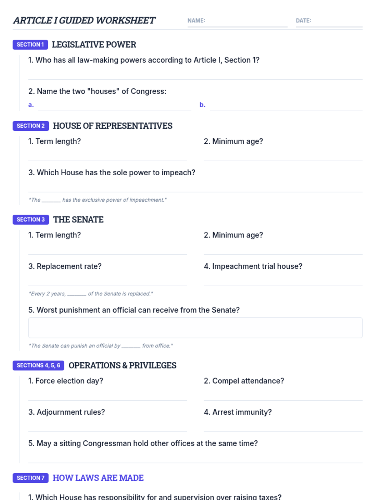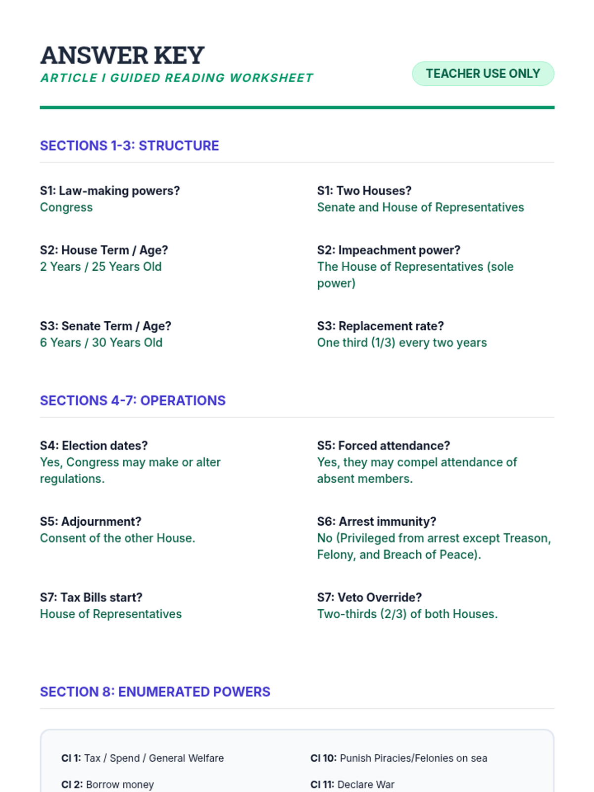 A detailed answer key for the Constitution Guided Worksheet, providing concise and accurate responses for every section of Article I, including the full list of enumerated powers and restraints.