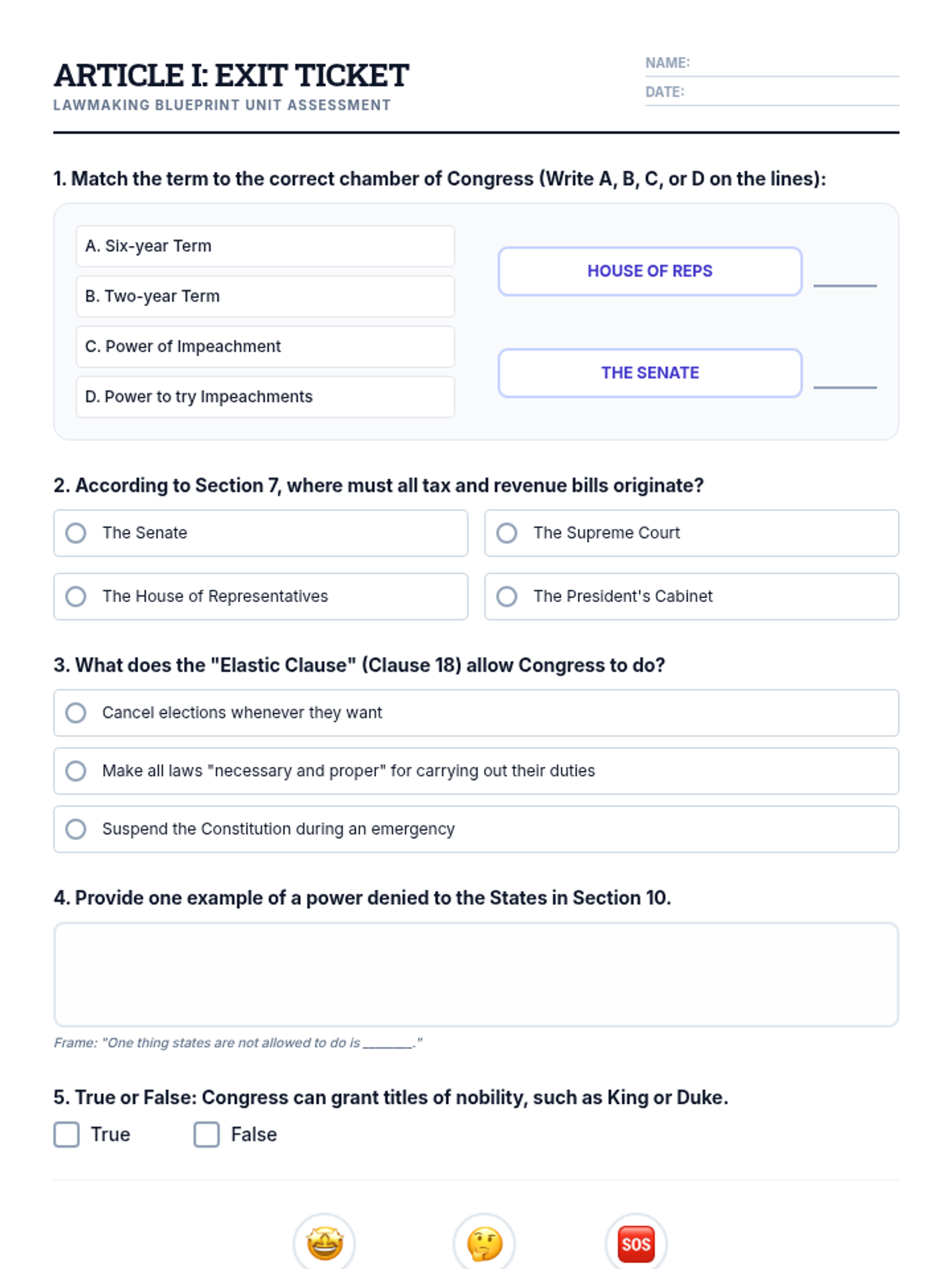 A 5-question formative assessment (exit ticket) for Article I of the Constitution, featuring matching, multiple-choice, and short-answer questions with integrated scaffolding.