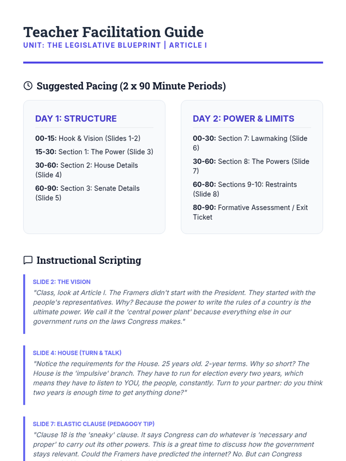 A detailed teacher facilitation guide for the Legislative Power lesson, including an instructional script, 180-minute pacing guide, common misconceptions, and specific IEP/LEP scaffolding strategies.