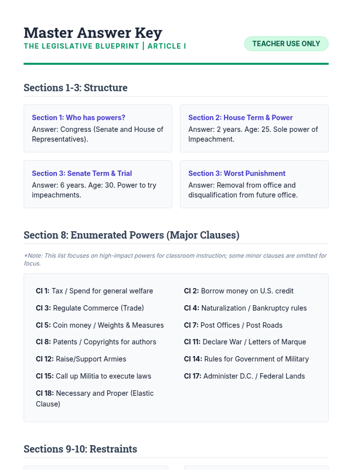 A master answer key for the Legislative Blueprint reader, providing correct annotations, a complete Section 8 power list, and sample answers with criteria for mastery for all paragraph-length review questions.