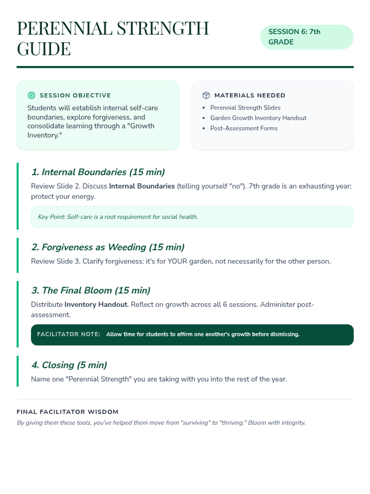 Lesson 6 slides for 6th graders on sustainable growth. Explores the internal nature of forgiveness and the critical importance of healthy social, digital, and emotional boundaries.