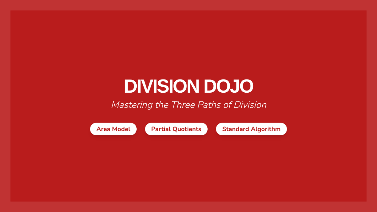 A comprehensive slide deck for teaching 4th-grade long division using the Area Model, Partial Quotients, and Standard Algorithm. Includes a warm-up, guided practice, independent ninja problems, and a full answer key.
