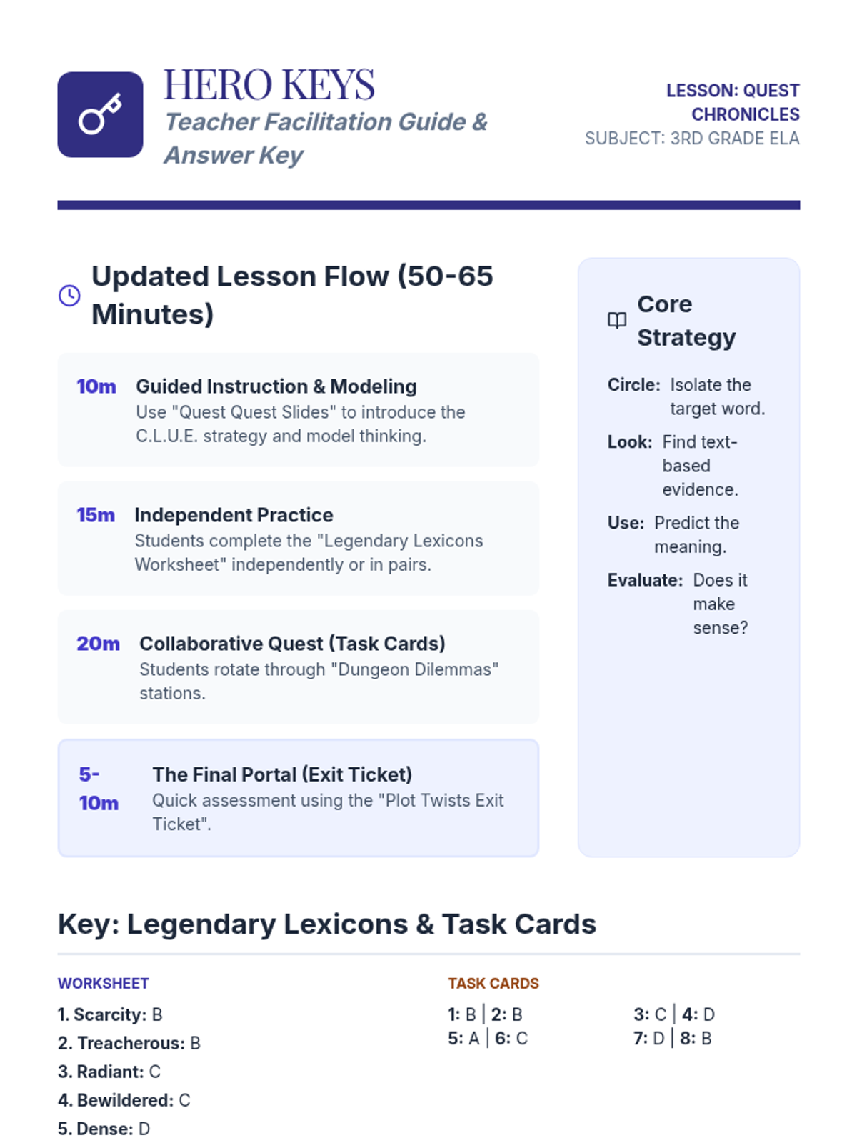 An updated teacher guide for the Quest Chronicles lesson, now including a 45-60 minute pacing plan, scoot activity tips, and answer keys for both the worksheet and task cards.