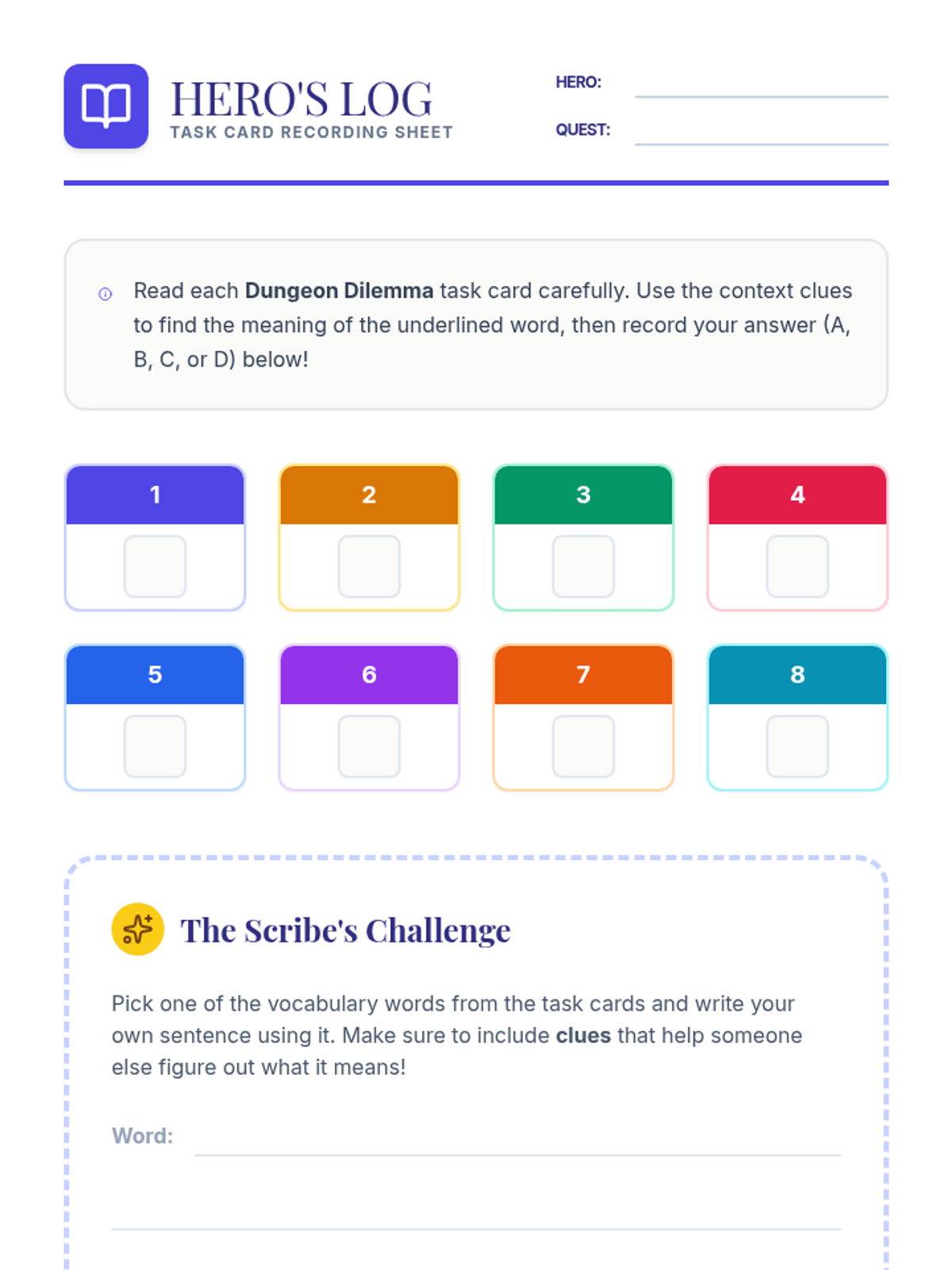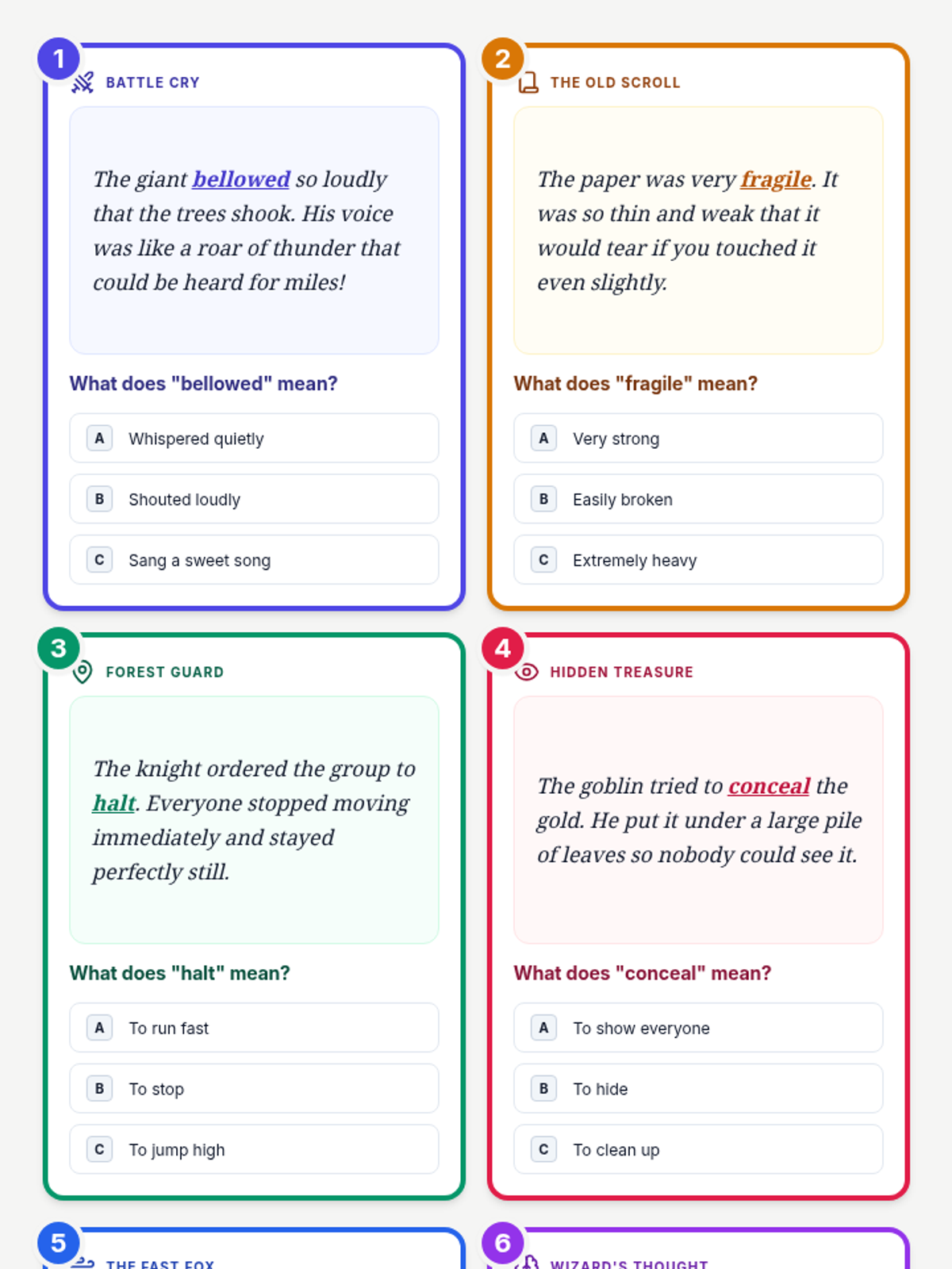 A set of 8 fantasy-themed task cards for practicing context clues, featuring words like bellowed, fragile, halt, and ancient with multiple-choice questions.