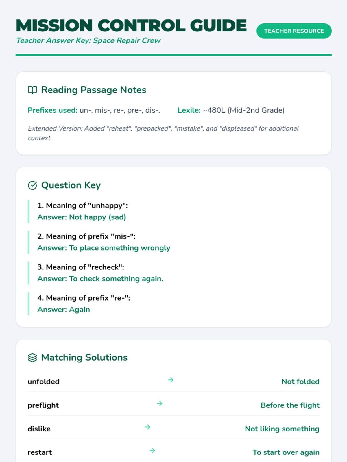 A teacher's answer key for the Space Repair Crew worksheet. Revised for better page breaks, clarified definitions, and added instructional strategies for educators.