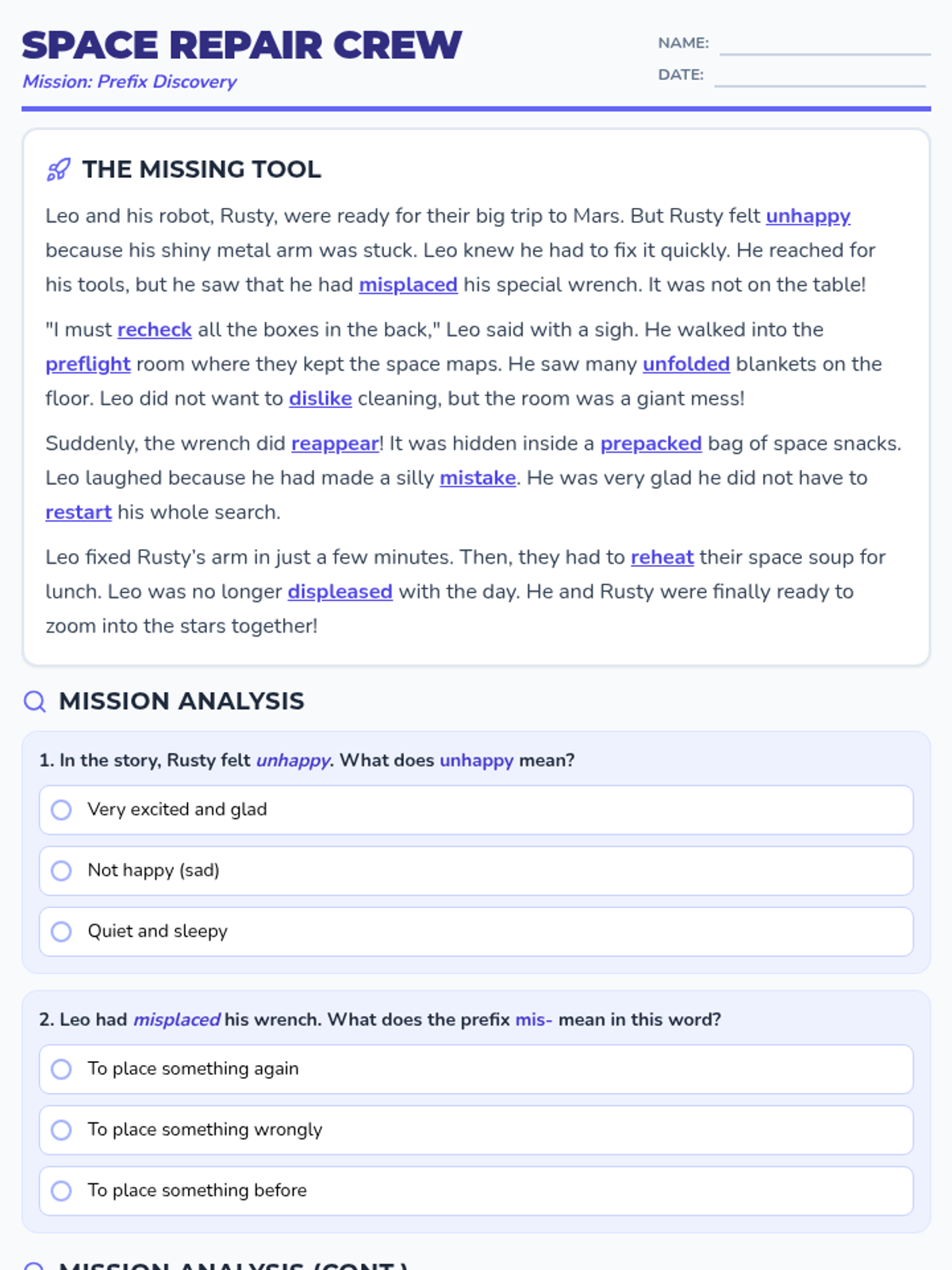 A space-themed reading passage for 2nd graders featuring common prefixes (un-, re-, dis-, pre-, mis-) with context-based comprehension questions and a matching activity. Consolidated to 2 pages with improved legibility for student work.