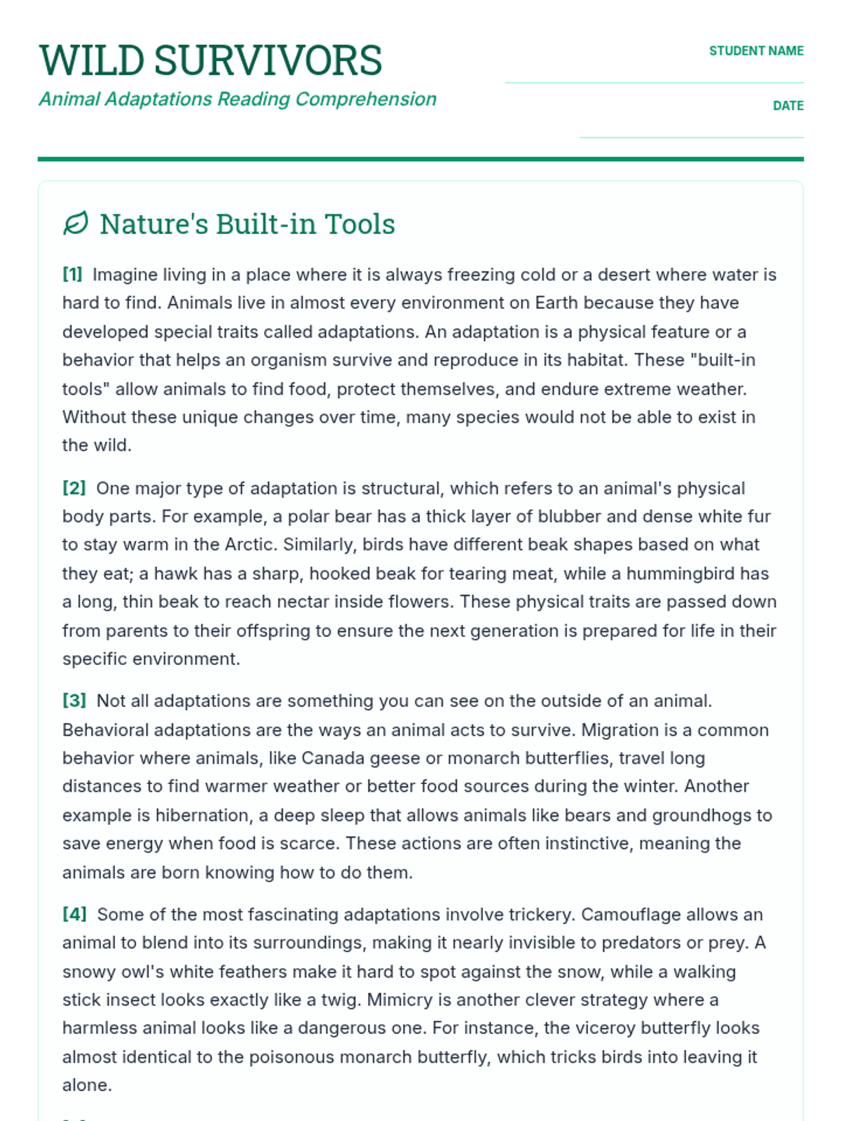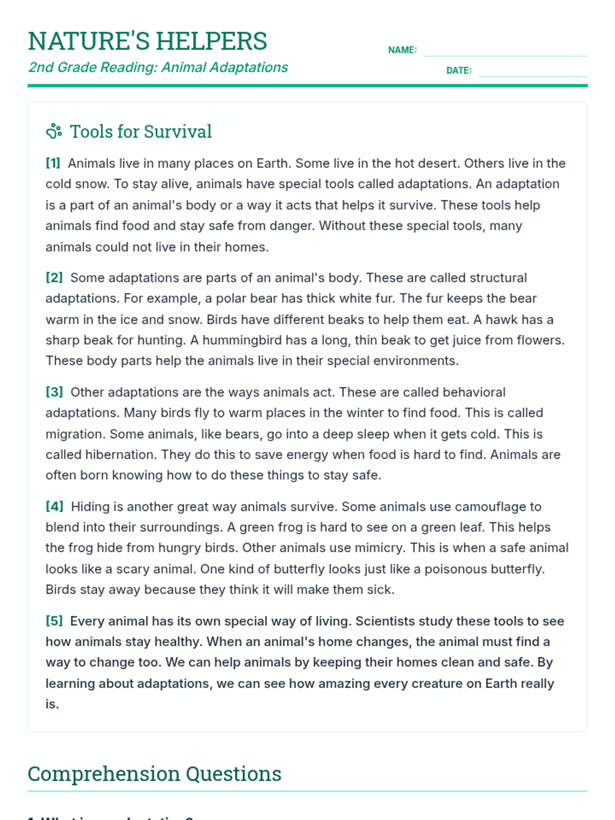 A 2nd-grade reading comprehension worksheet about animal adaptations. It includes a 5-paragraph passage, 5 multiple-choice questions, and a teacher's answer key with paragraph references.