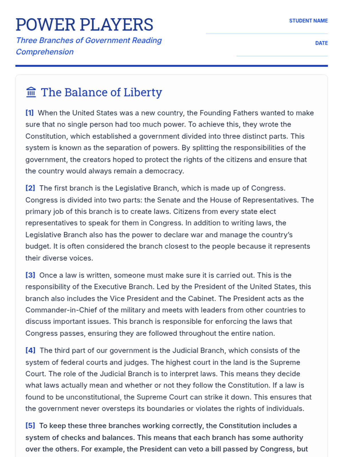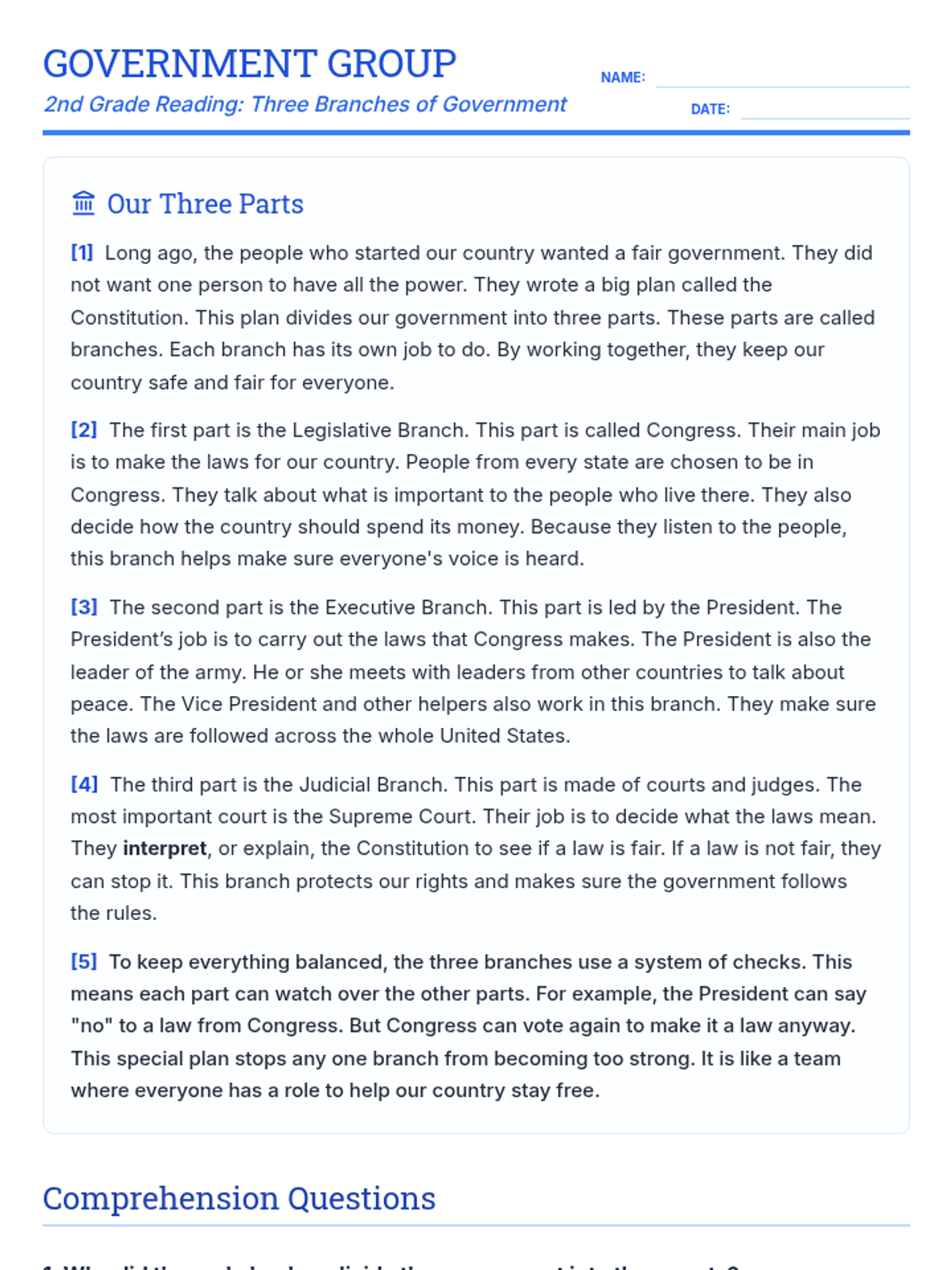 A 2nd-grade reading comprehension worksheet about the three branches of government. It includes a 5-paragraph passage, 5 multiple-choice questions, and a teacher's answer key with paragraph references.