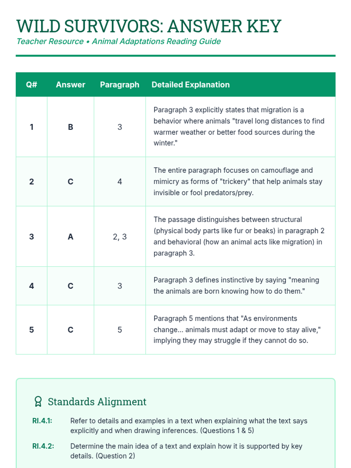 A 4th-grade science reading comprehension worksheet about animal adaptations, featuring a 5-paragraph passage and 5 multiple-choice questions aligned with ELA standards RI.1, RI.2, RI.3, and RI.4. Includes a separate answer sheet page with paragraph references and explanations.