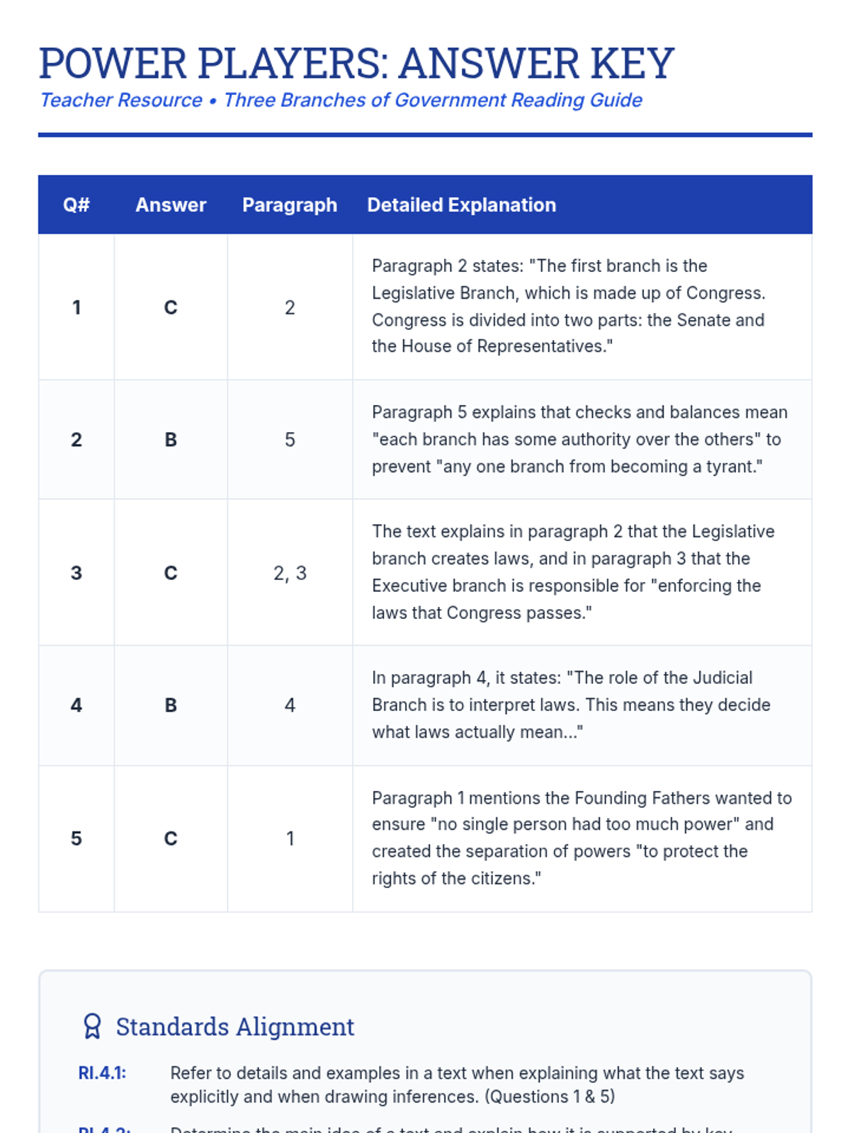 A 4th-grade social studies reading comprehension worksheet about the three branches of government, featuring a 5-paragraph passage and 5 multiple-choice questions aligned with ELA standards RI.1, RI.2, RI.3, and RI.4. Includes a separate answer sheet page with paragraph references and explanations.