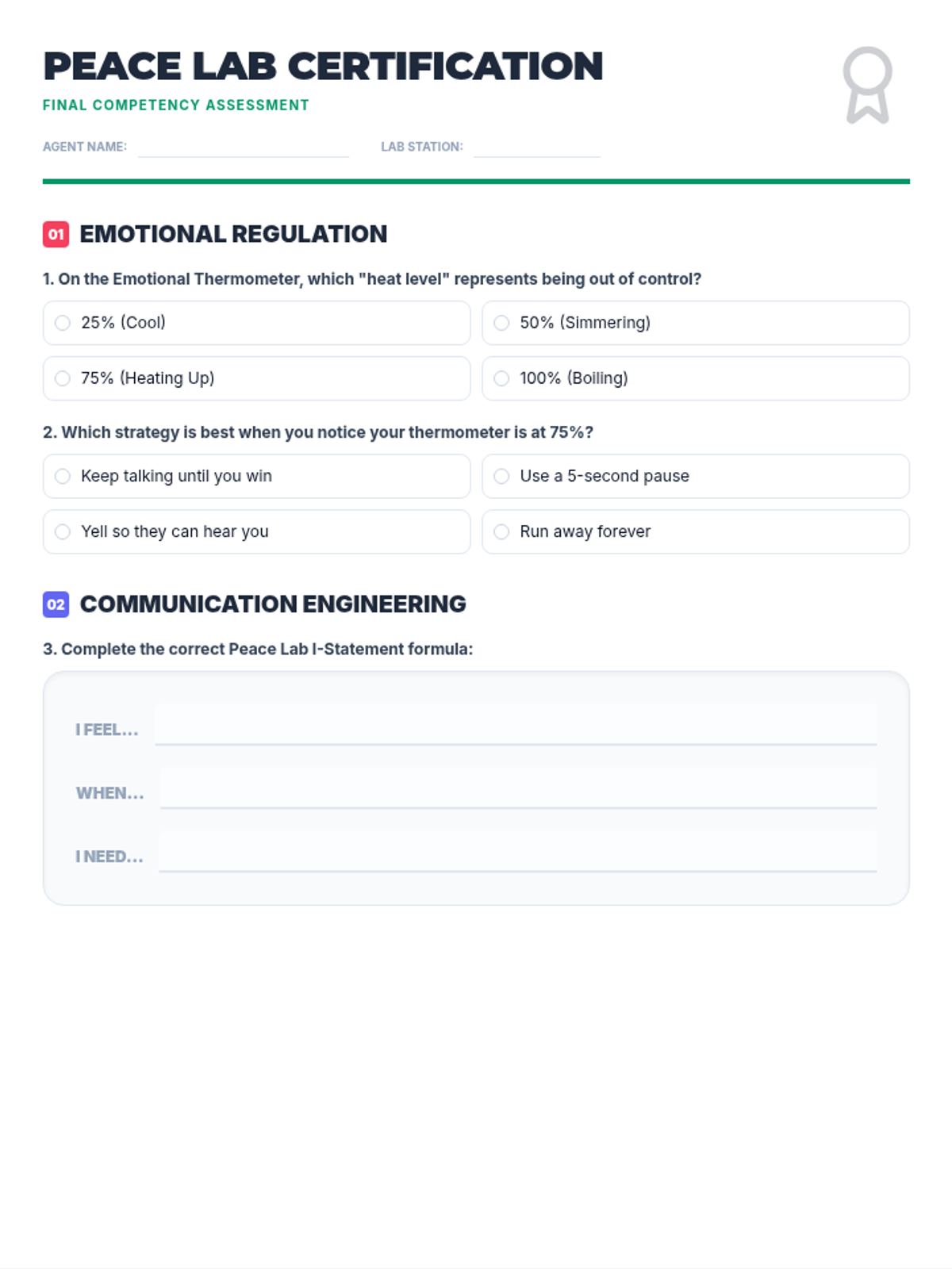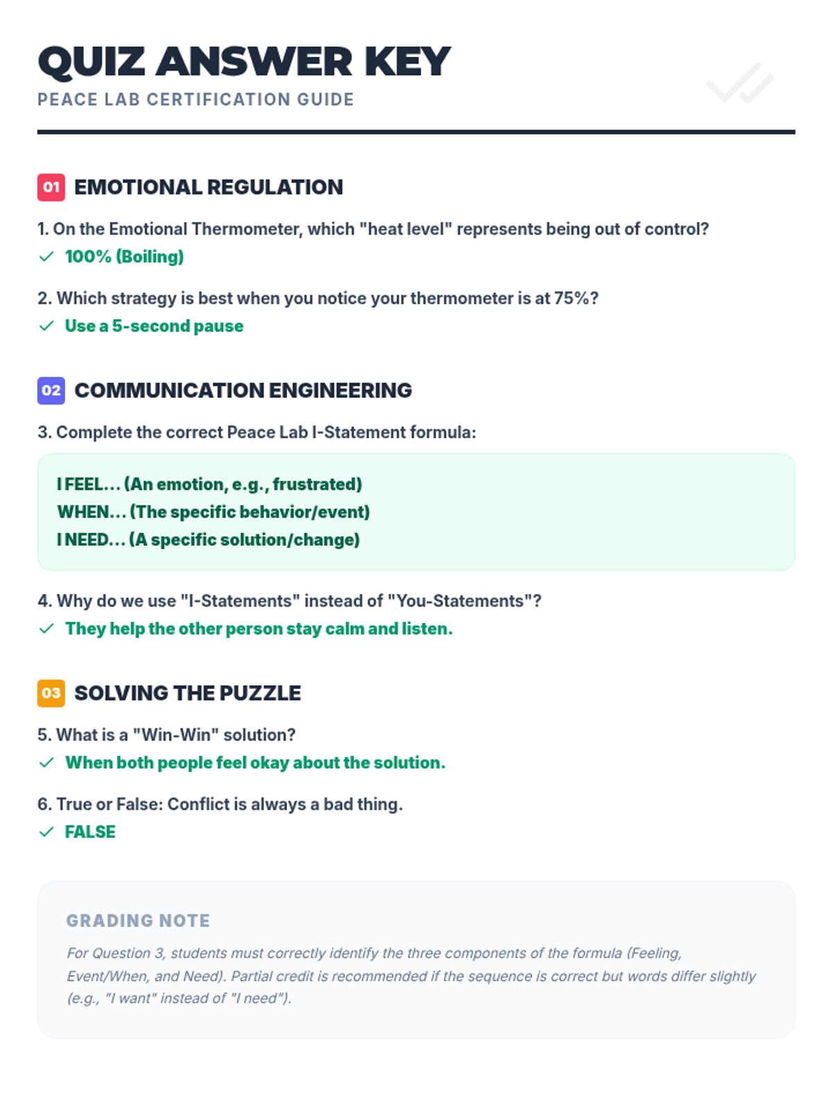 A comprehensive 6-question quiz ('Certification') to assess student understanding of the Peace Lab concepts: emotional regulation, I-statements, and win-win solutions.