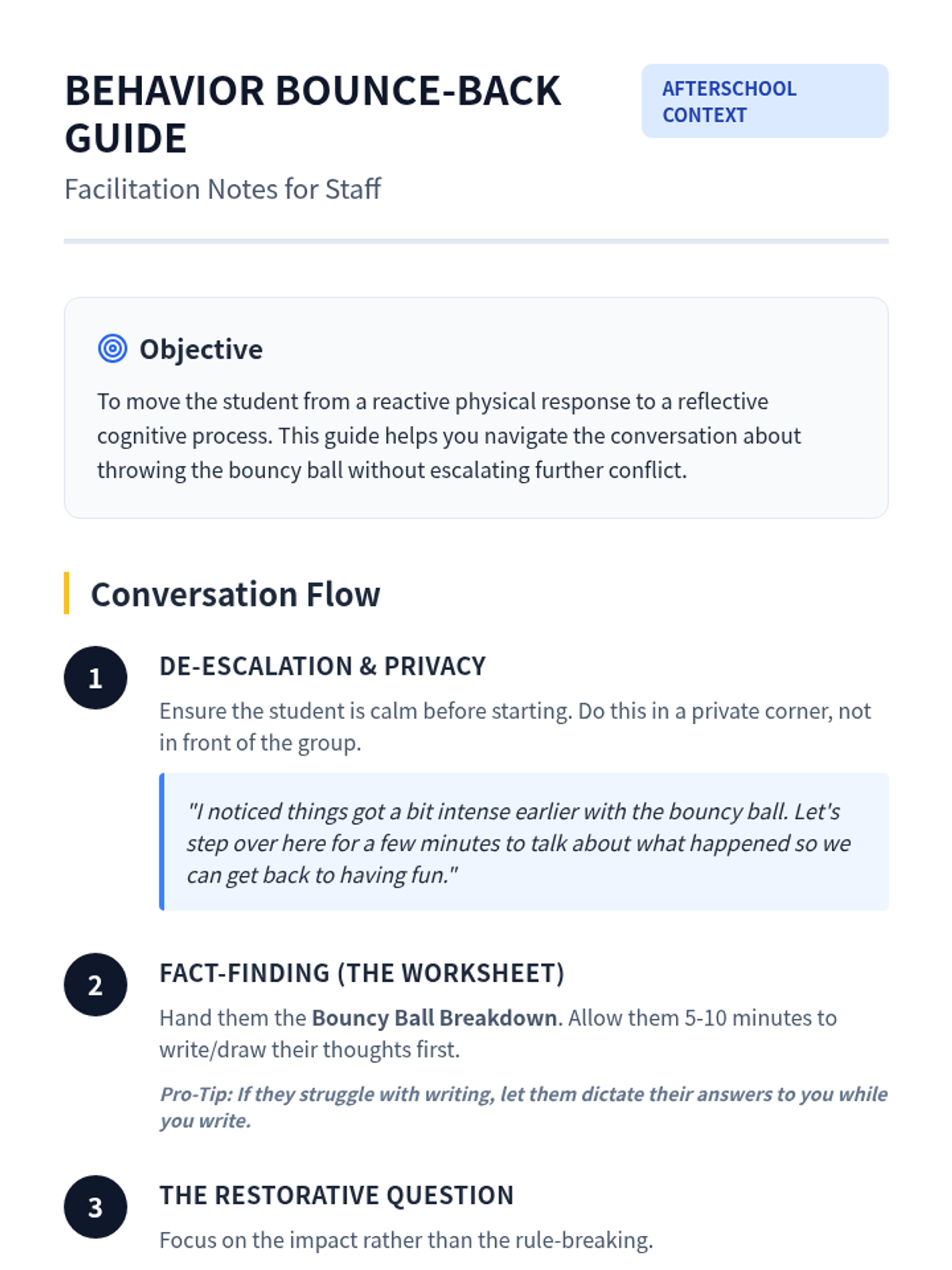 A facilitation guide for afterschool staff to conduct a restorative conversation with a student about throwing objects. Revised to fix page breaks and include a notes section.