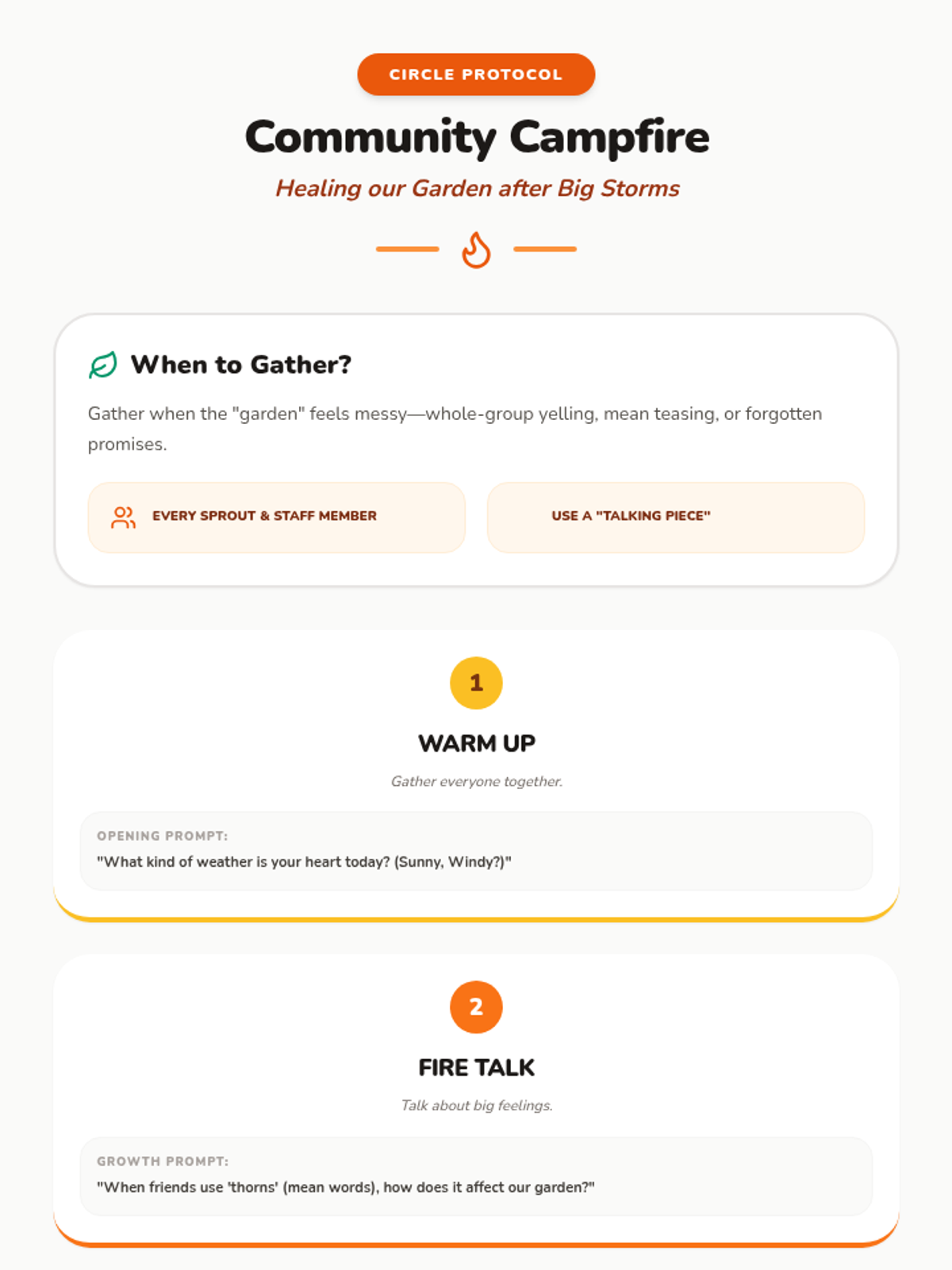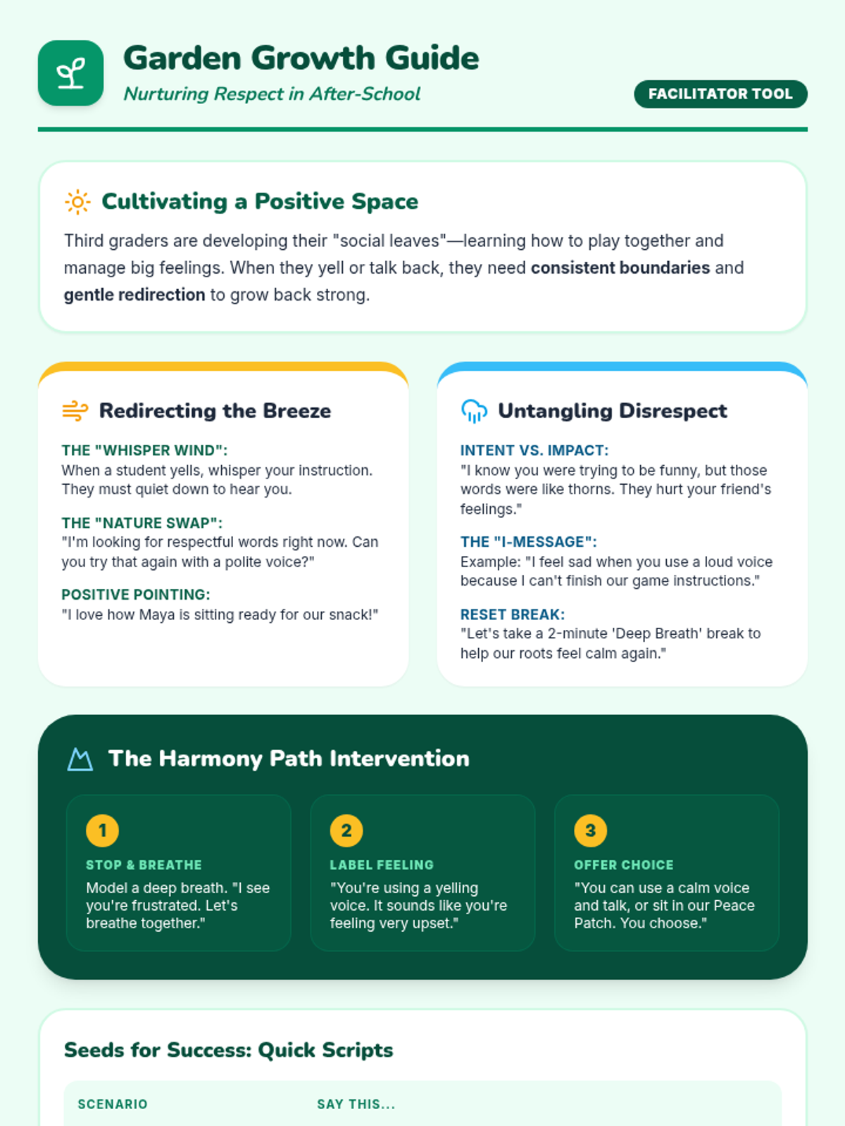 A colorful, nature-themed facilitator guide for after-school staff, providing 3rd-grade appropriate scripts and de-escalation strategies for handling disrespect and big emotions.