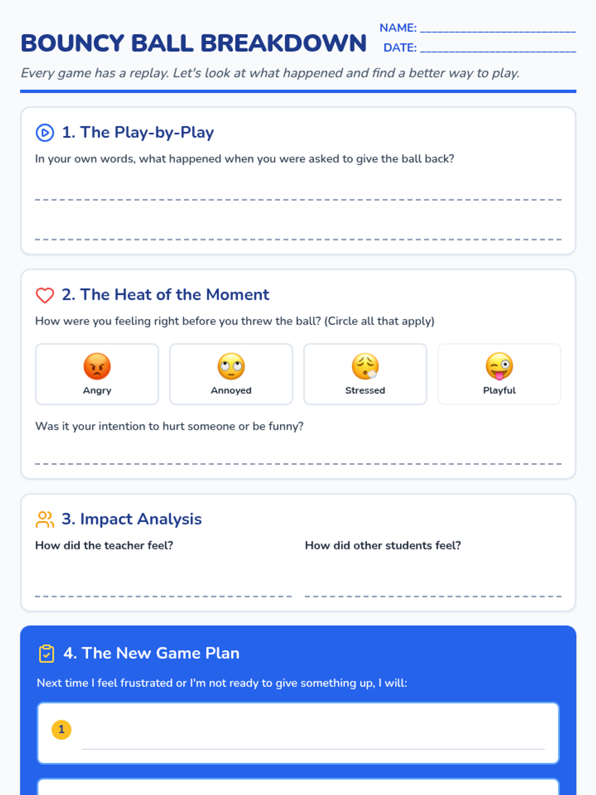 A reflective behavior worksheet for students to process the ball-throwing incident, focusing on feelings, impact, and future strategies. Optimized for single-page printing with legible work areas.