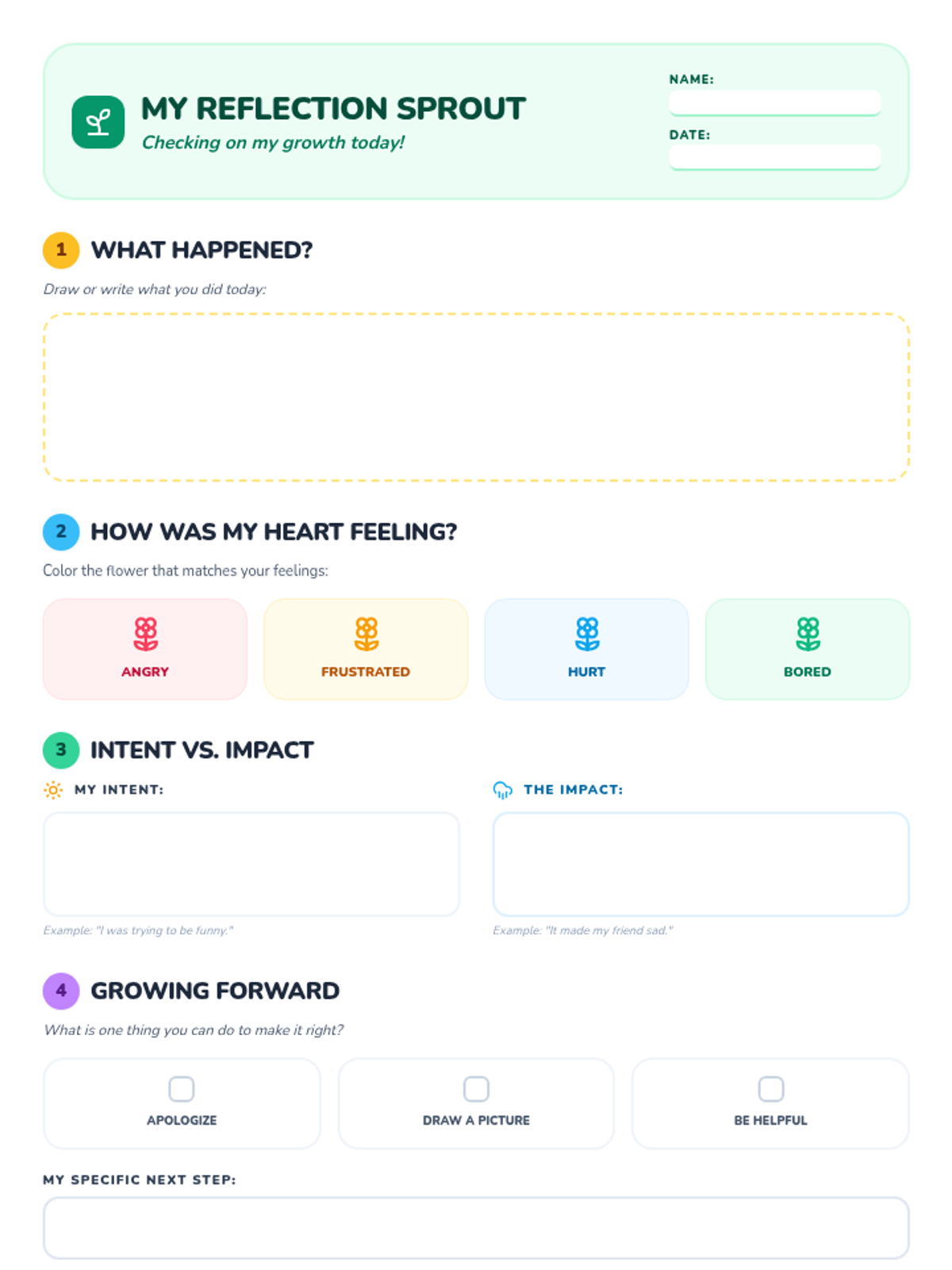 A colorful, nature-themed student reflection worksheet for 3rd graders to process behavior, understand feelings, and plan restorative steps.