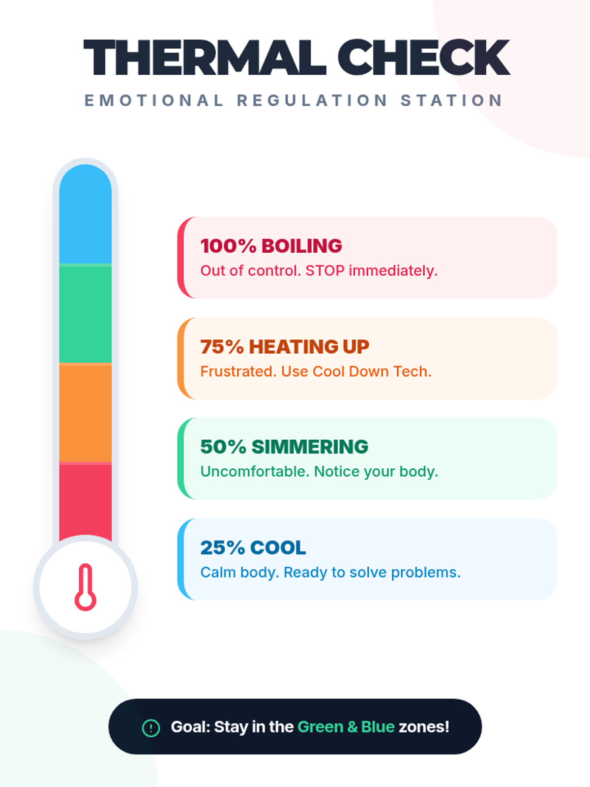 A personal reflection worksheet where students identify their own triggers and physical warning signs. They select a primary 'System Override' technique to commit to using in future high-tension situations.