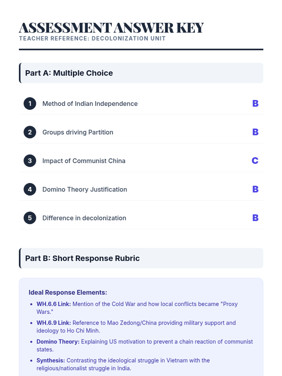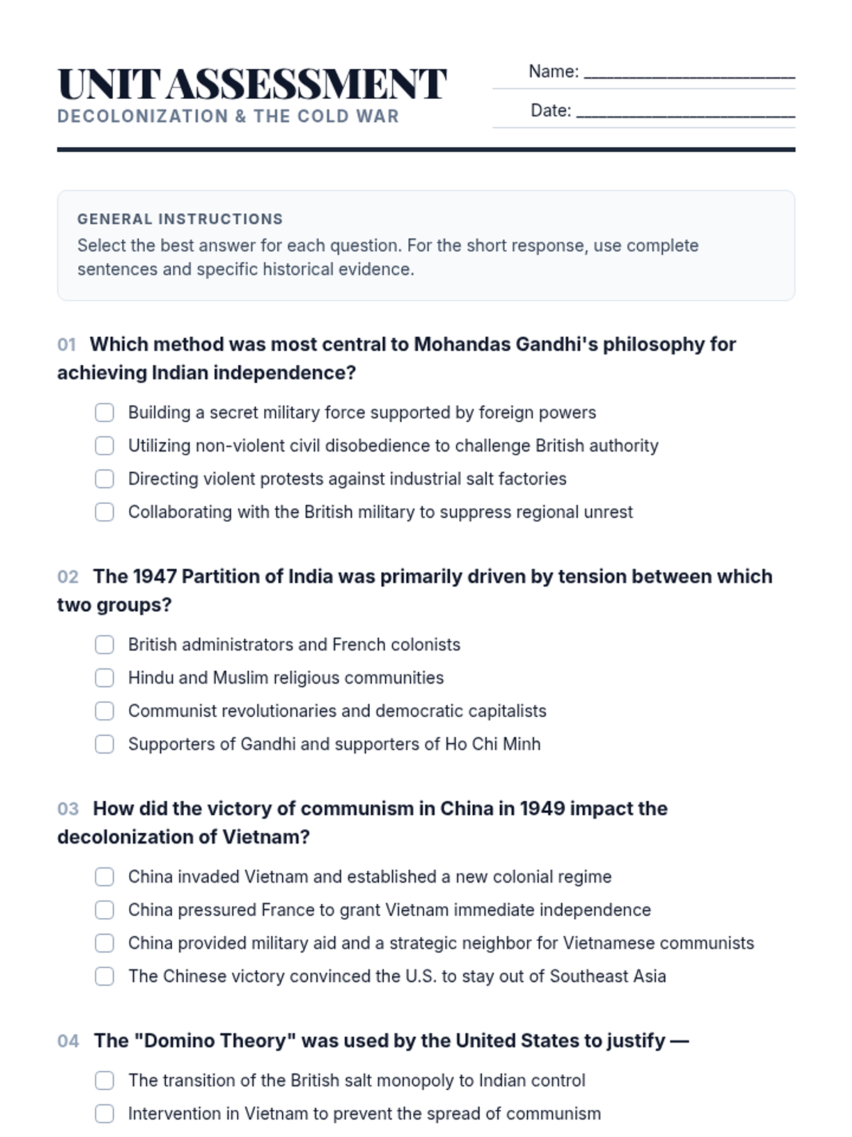 A student-facing study guide for the decolonization of India and Vietnam, summarizing key figures, concepts, and review questions aligned with standards.