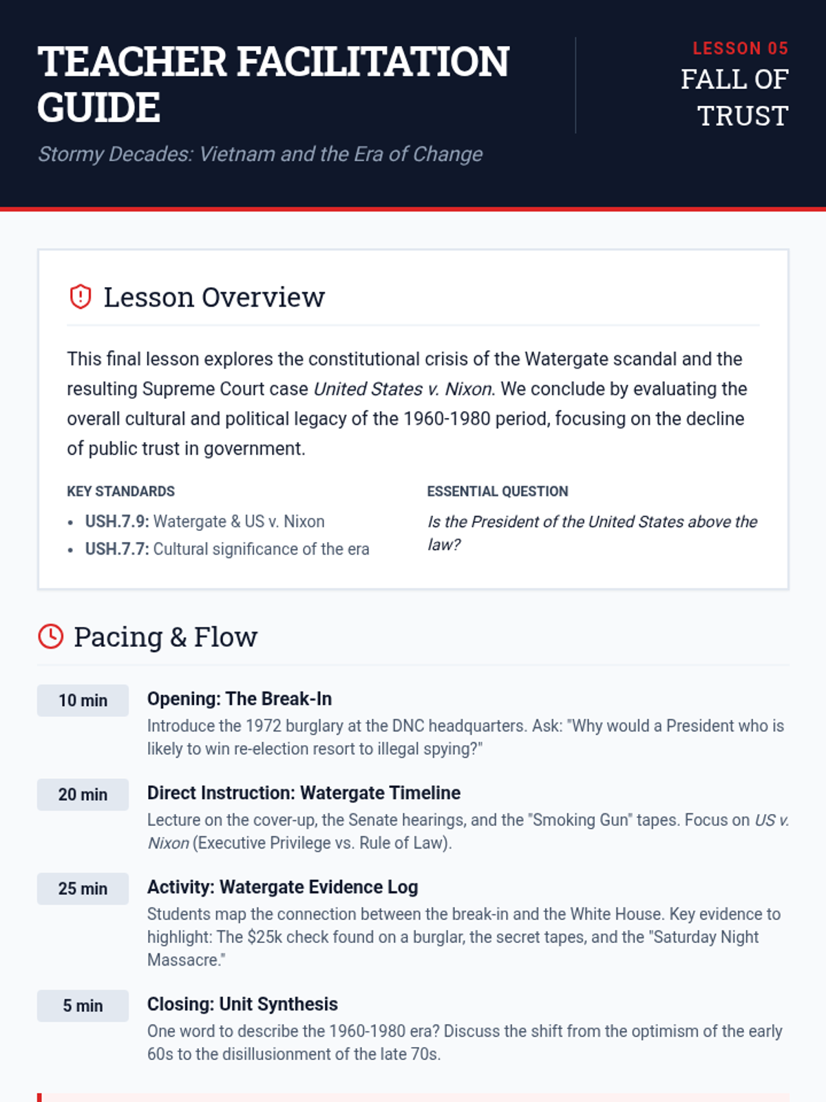 Teacher facilitation guide for Lesson 5, focusing on the Watergate scandal, the Supreme Court's ruling in US v. Nixon, and the unit's final synthesis.