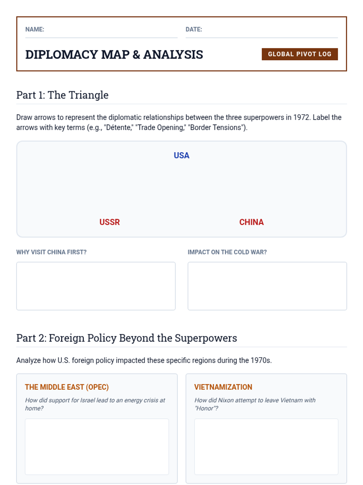 Student worksheet for Lesson 4, featuring a triangular diplomacy mapping exercise and analysis of 1970s foreign policy in the Middle East and Vietnam.