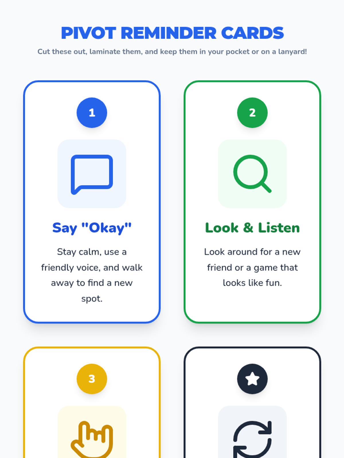 A set of printable pocket cards with visual icons summarizing the Playground Pivot steps for students to use during recess.