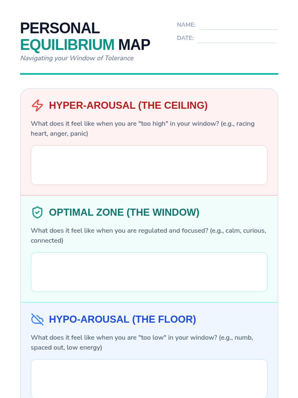 A two-page student activity sheet for mapping individual Window of Tolerance zones and practicing the STOP technique with real-world 8th-grade scenarios.