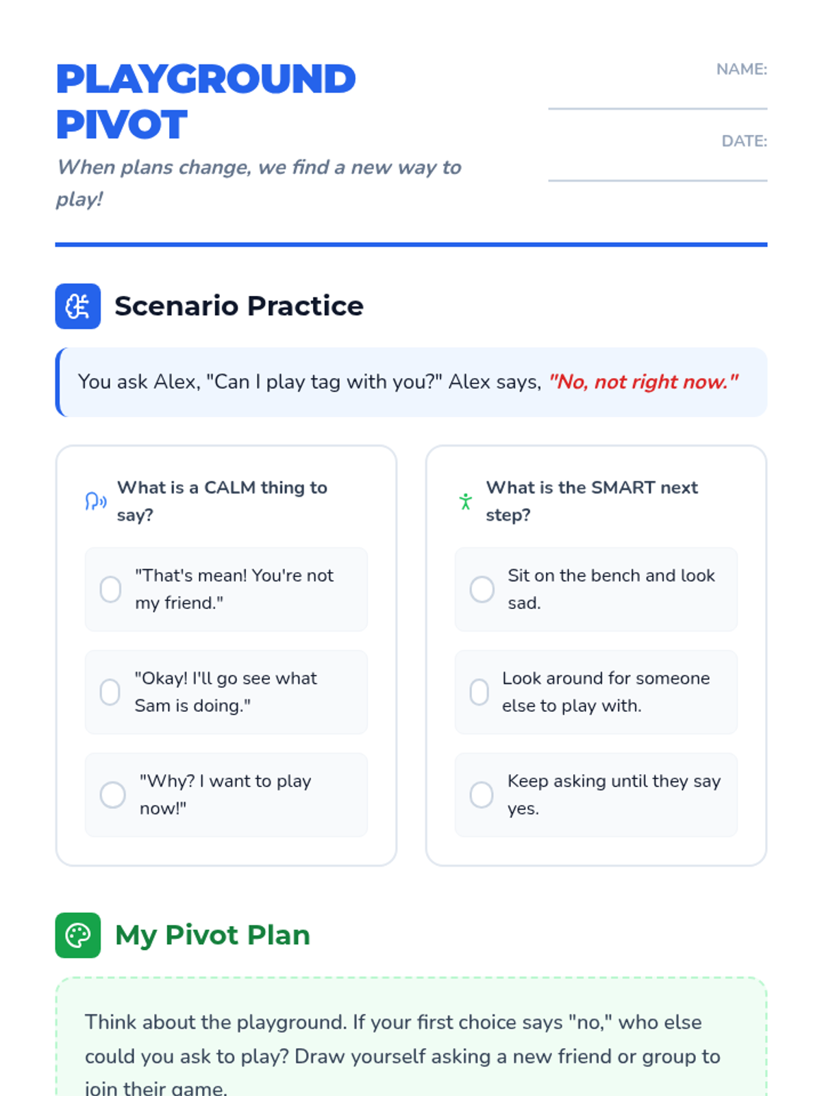 A student reflection worksheet that reinforces the 'Playground Pivot' steps through scenario practice and drawing.