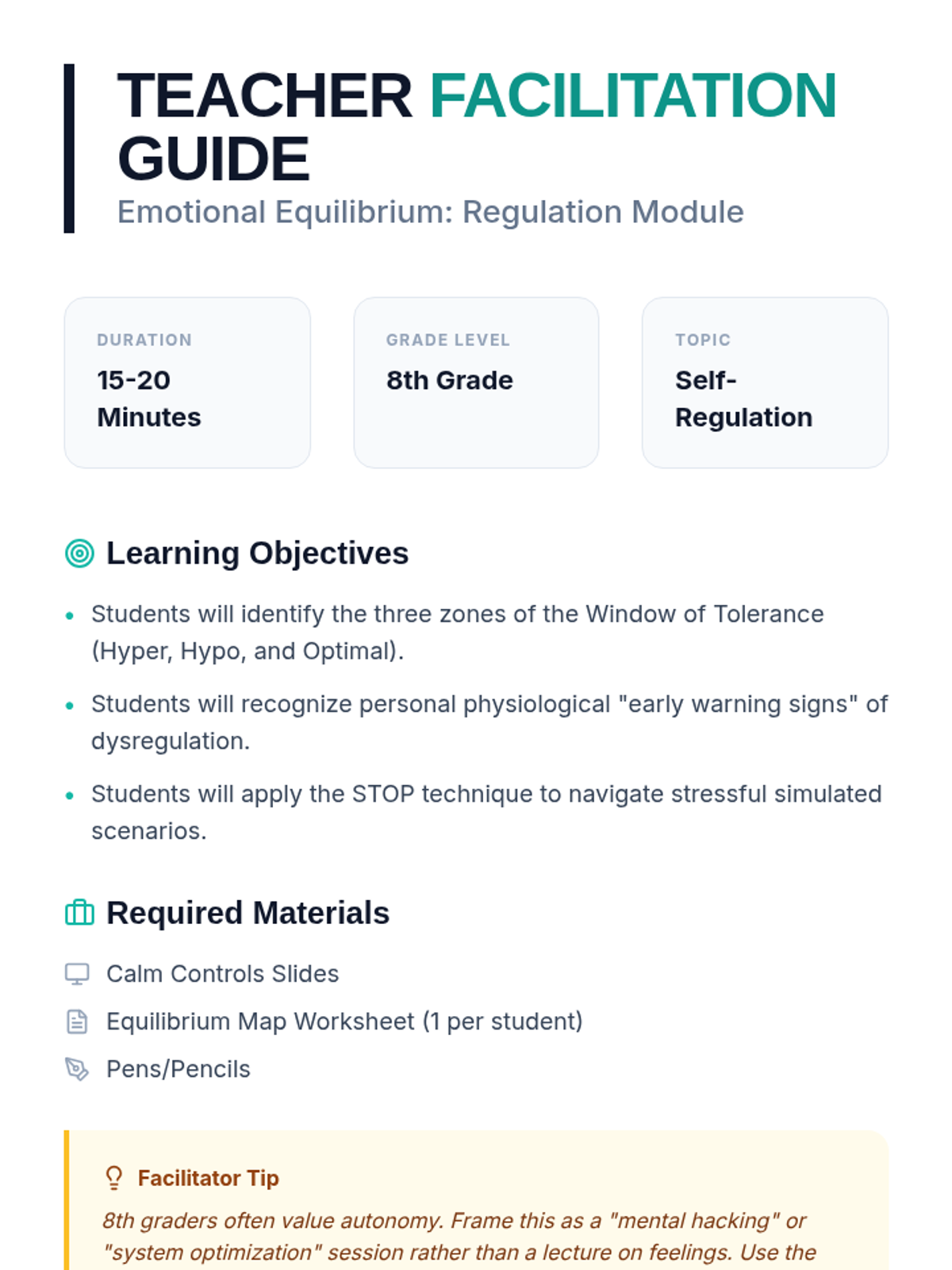 A comprehensive teacher facilitation guide for the Emotional Equilibrium lesson, providing step-by-step instructions, discussion prompts, and learning objectives.
