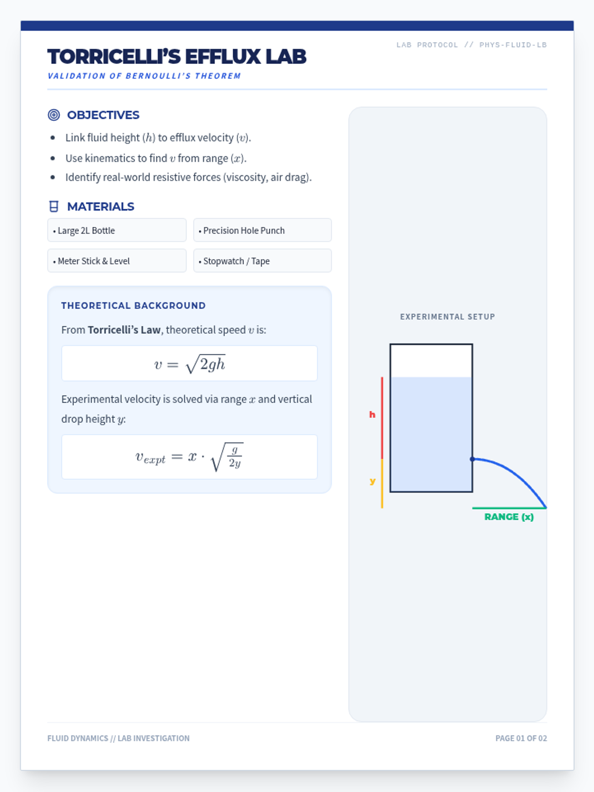 A hands-on laboratory activity for AP Physics students to experimentally verify Torricelli's Law. Students measure the horizontal range of fluid efflux as a function of depth, utilizing kinematic analysis and error accounting for non-ideal fluid behavior. Revised to fix page break issues and improve graphing areas.