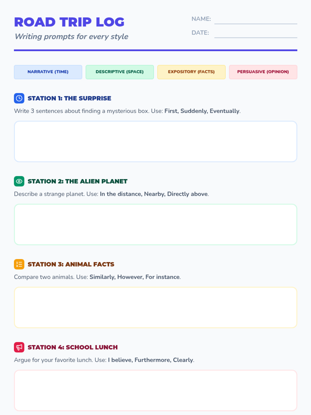 A writing prompt worksheet that provides specific transition words for students to use across four different writing styles.