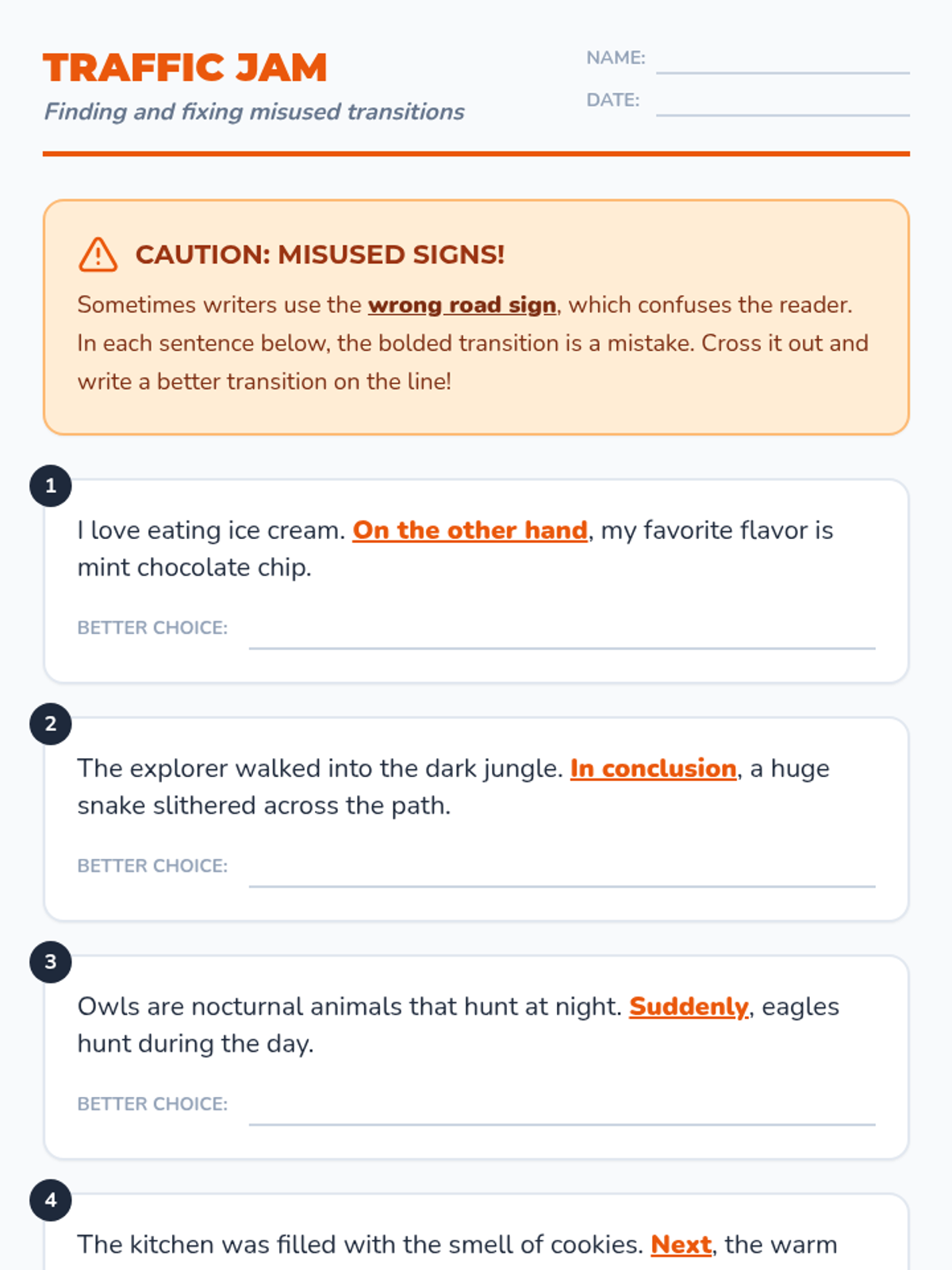 A worksheet where students identify and correct misused transition words in sentences, focusing on logic and context.