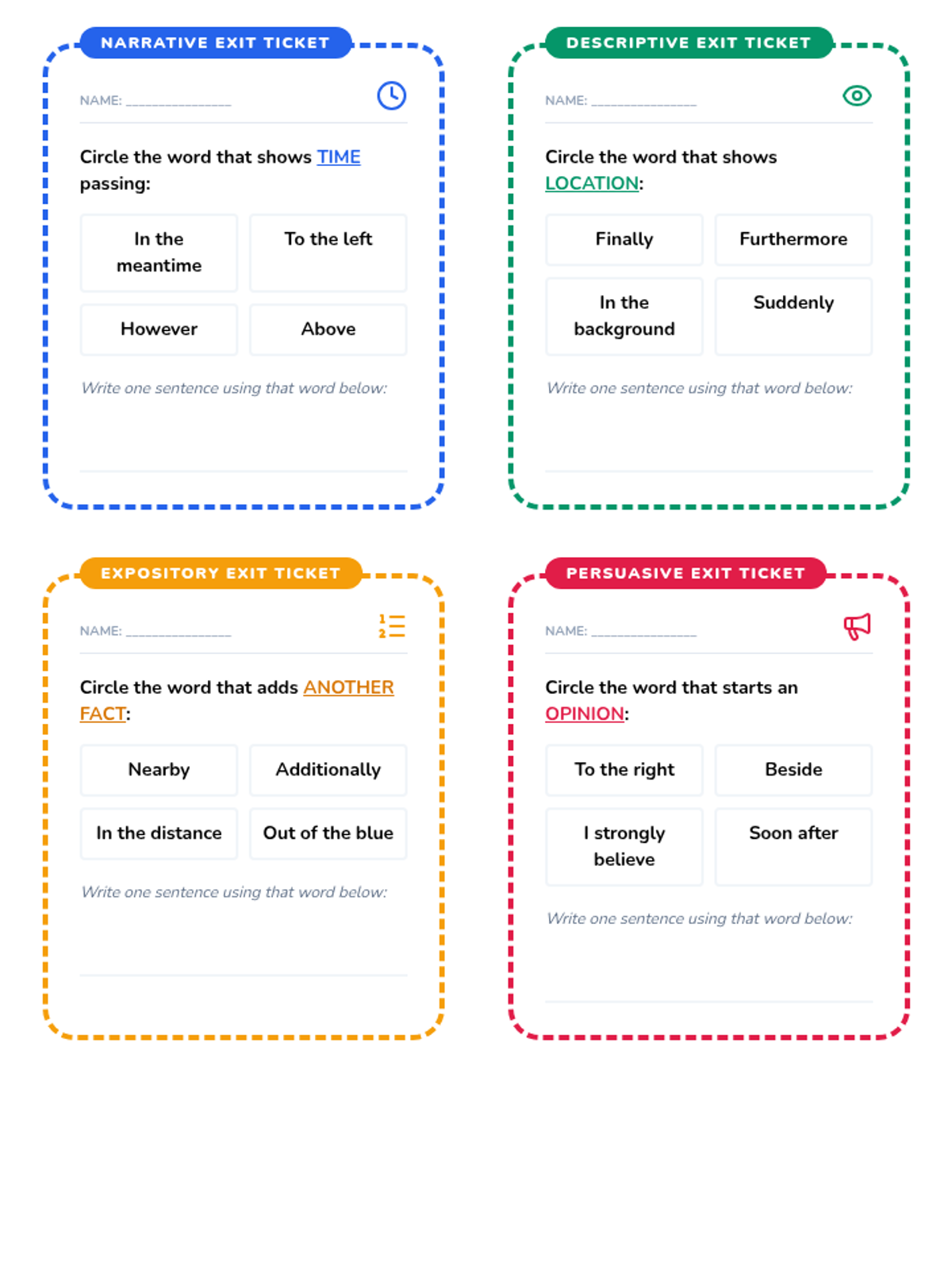 A set of four quick-check exit tickets for assessing student understanding of transitions in narrative, descriptive, expository, and persuasive writing.