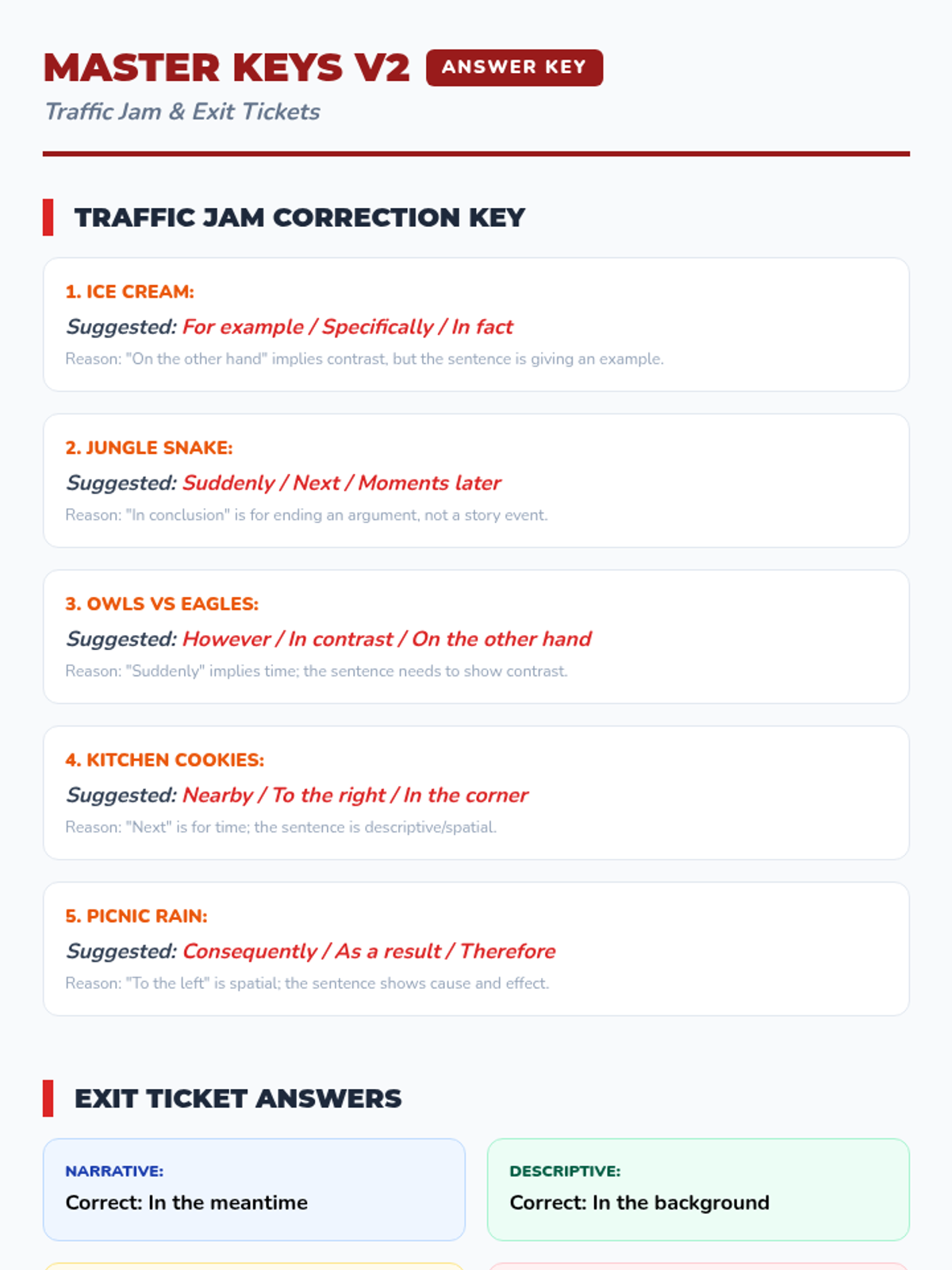 An answer key for the Traffic Jam and Exit Ticket worksheets, providing correct responses and logical explanations for misused transitions.