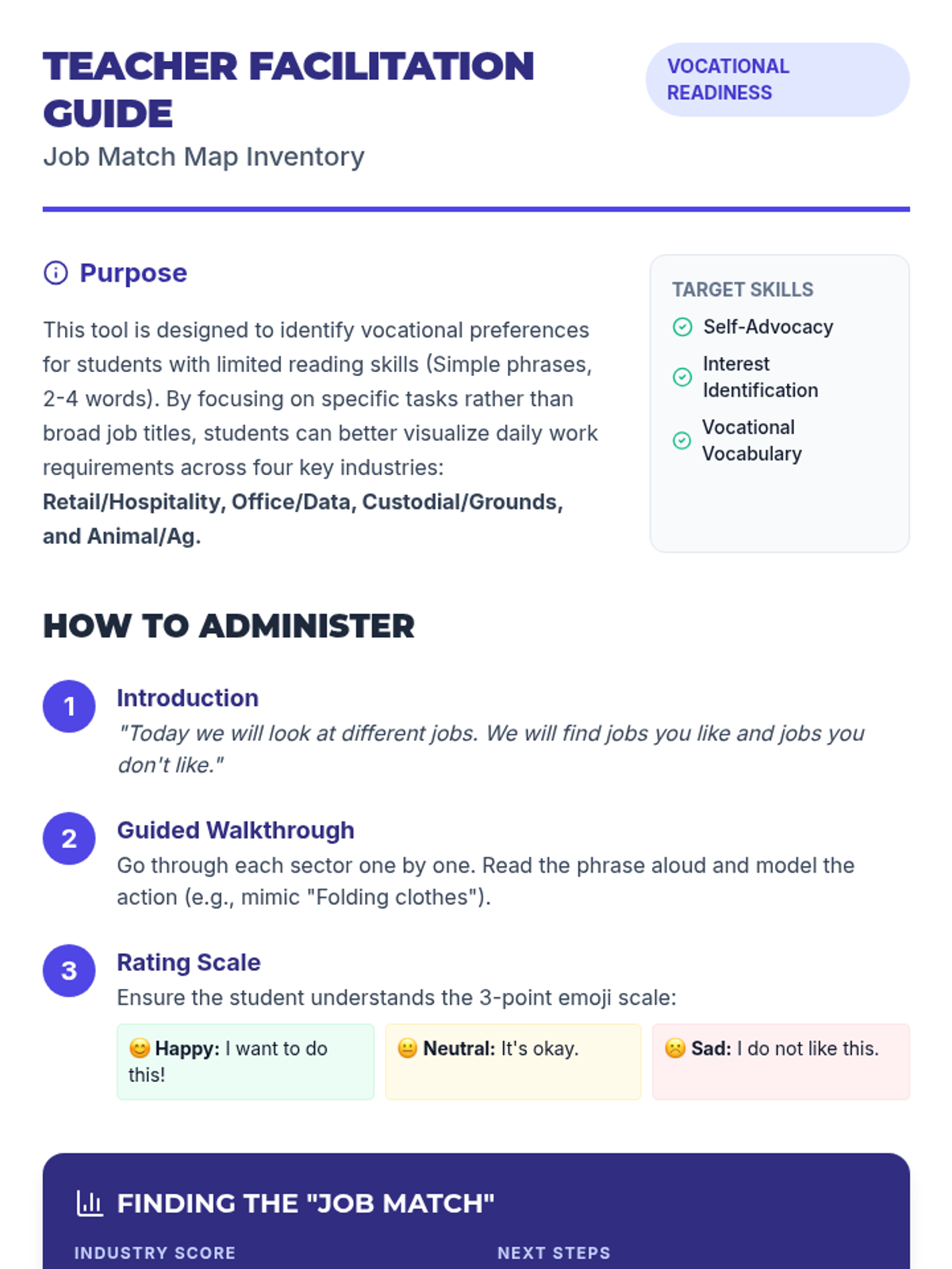 An instructional guide for educators to facilitate the Job Match Map Inventory. Includes administration steps, scoring tips, and extension ideas for low-reading-level students.