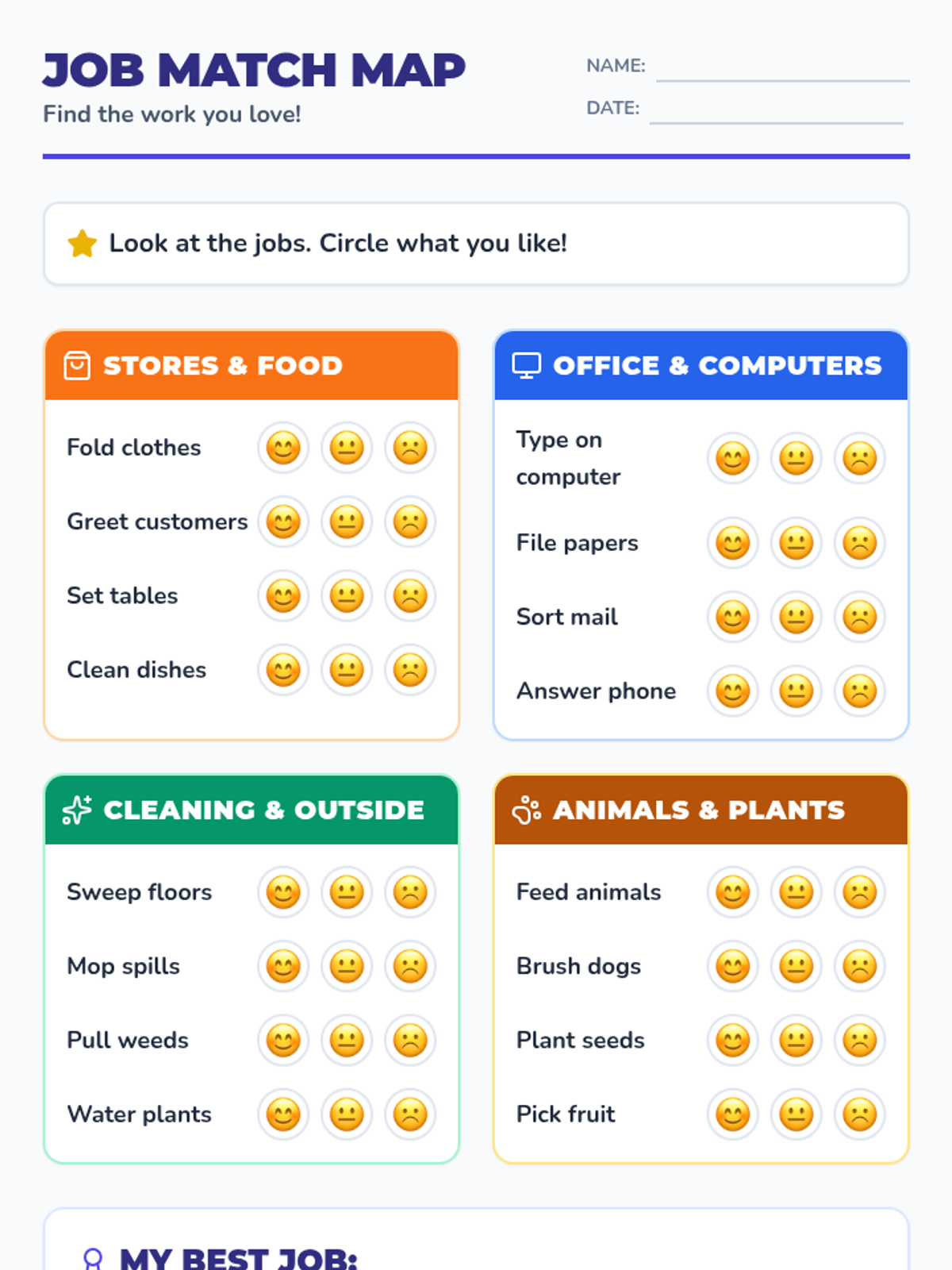 A visual interest inventory for students with low reading levels. Features 16 job tasks across four industries with simple emoji-based rating scales.