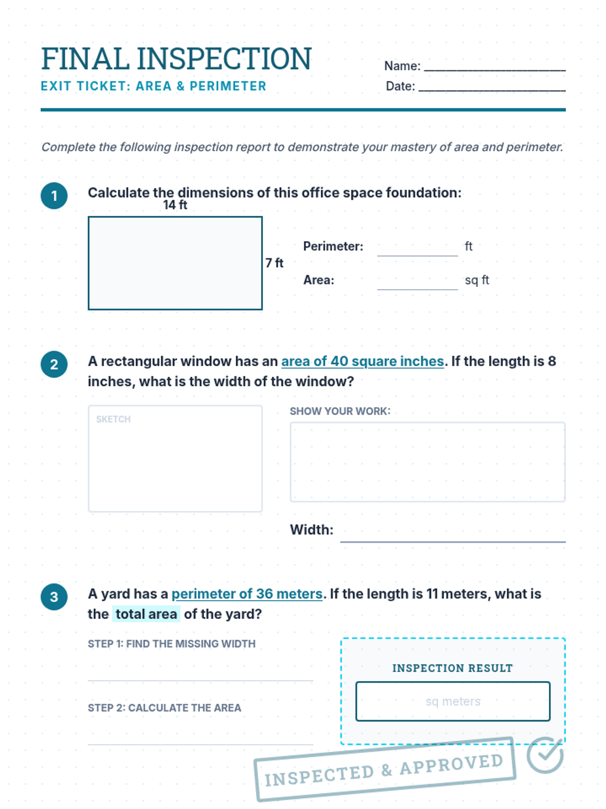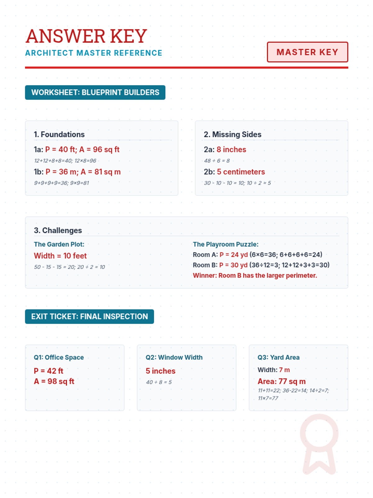 A consolidated single-page answer key for both the Blueprint Builders worksheet and the Final Inspection exit ticket. Includes all calculations and final solutions.