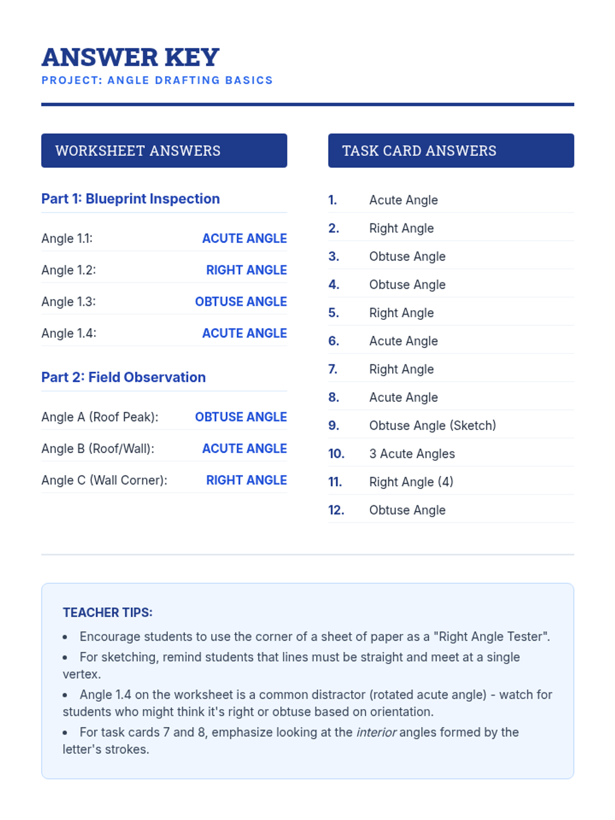 Answer key for the Angle Drafting worksheet and task cards, providing solutions and teaching tips. Revised for better formatting and consistency.