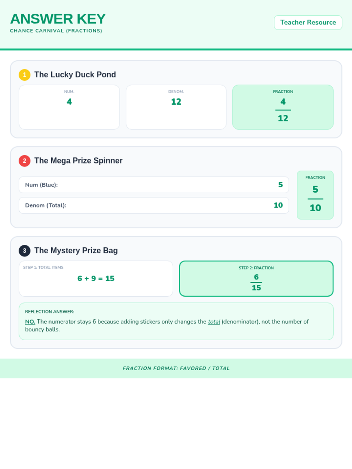 The answer key for the Chance Carnival Do Now worksheet, providing correct outcomes and ratios for all three scaffolded probability problems. Revised with fraction notation.