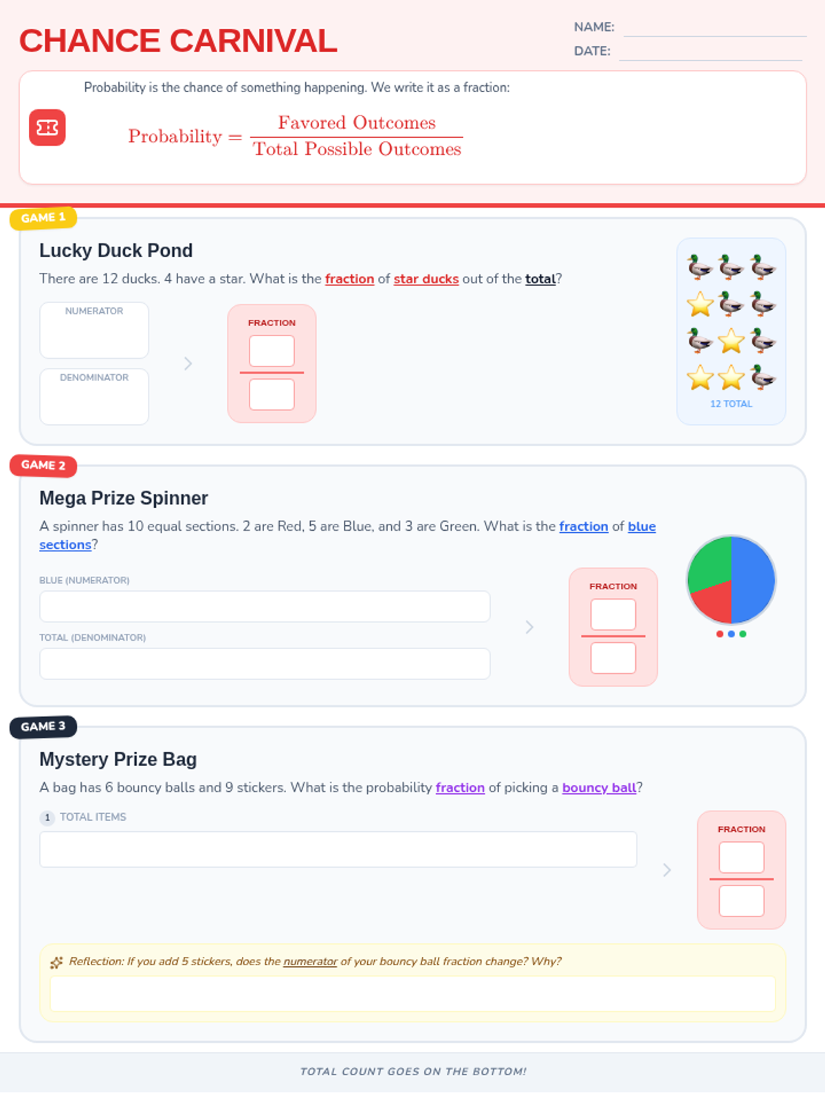 A carnival-themed math Do Now worksheet focusing on probability fractions. It includes three scaffolded problems: identifying outcomes in a duck pond, interpreting a prize spinner, and calculating totals for a mystery prize bag. Revised with standardized fraction notation and improved spacing.