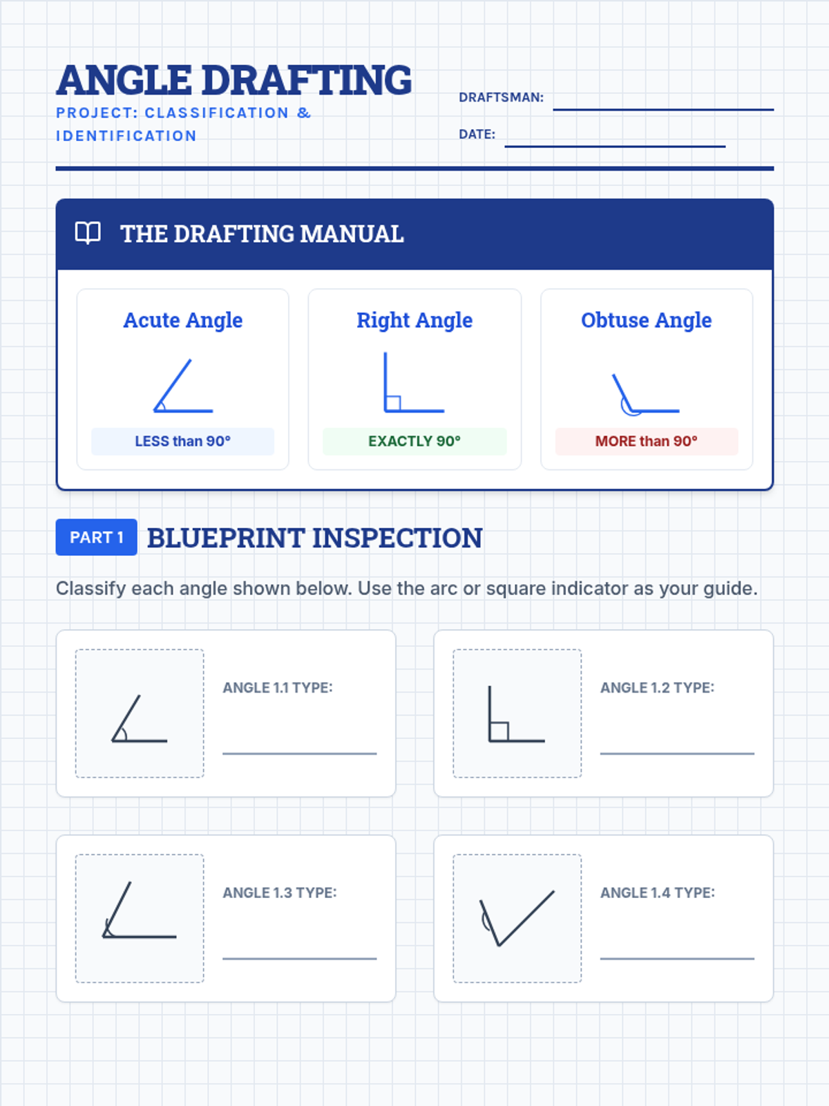 A blueprint-themed worksheet for identifying and sketching acute, obtuse, and right angles. Features technical illustrations, a drafting manual reference section, and real-world application problems. Revised to fix page breaks, contrast issues, and illustration clarity.