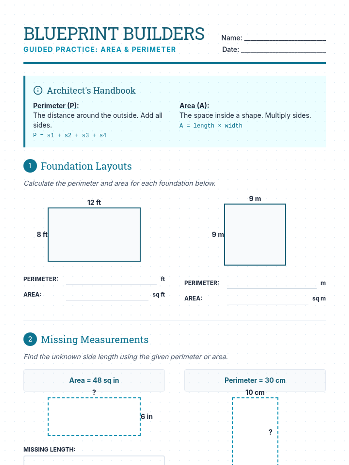 A 2-page guided practice worksheet where students solve area and perimeter problems in an architectural blueprint theme. Includes basic calculations, missing side lengths, and multi-step real-world word problems. Revised for better page flow and contrast.