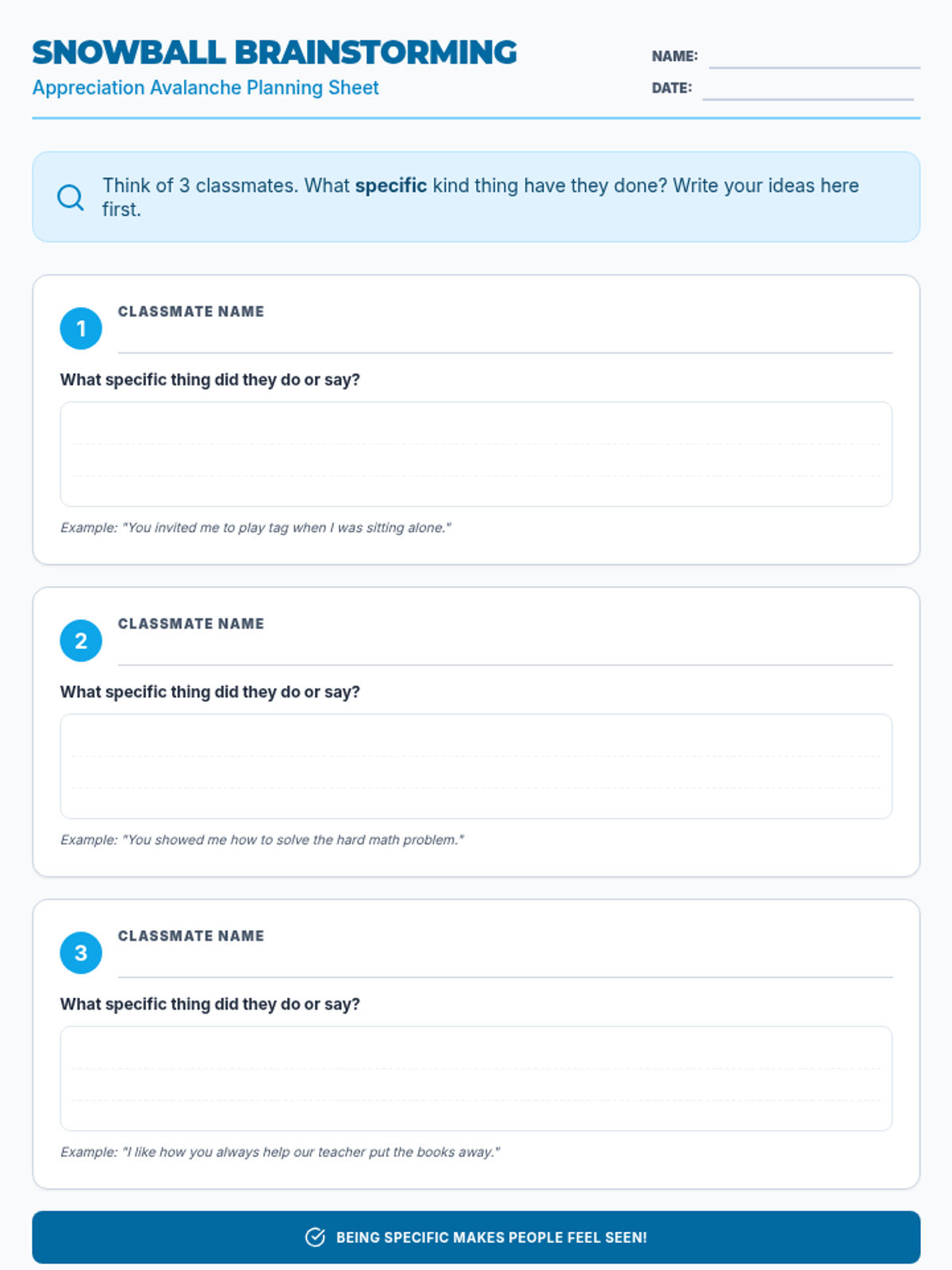 A brainstorming worksheet for students to plan three specific appreciations for their classmates before creating their final snowflakes.