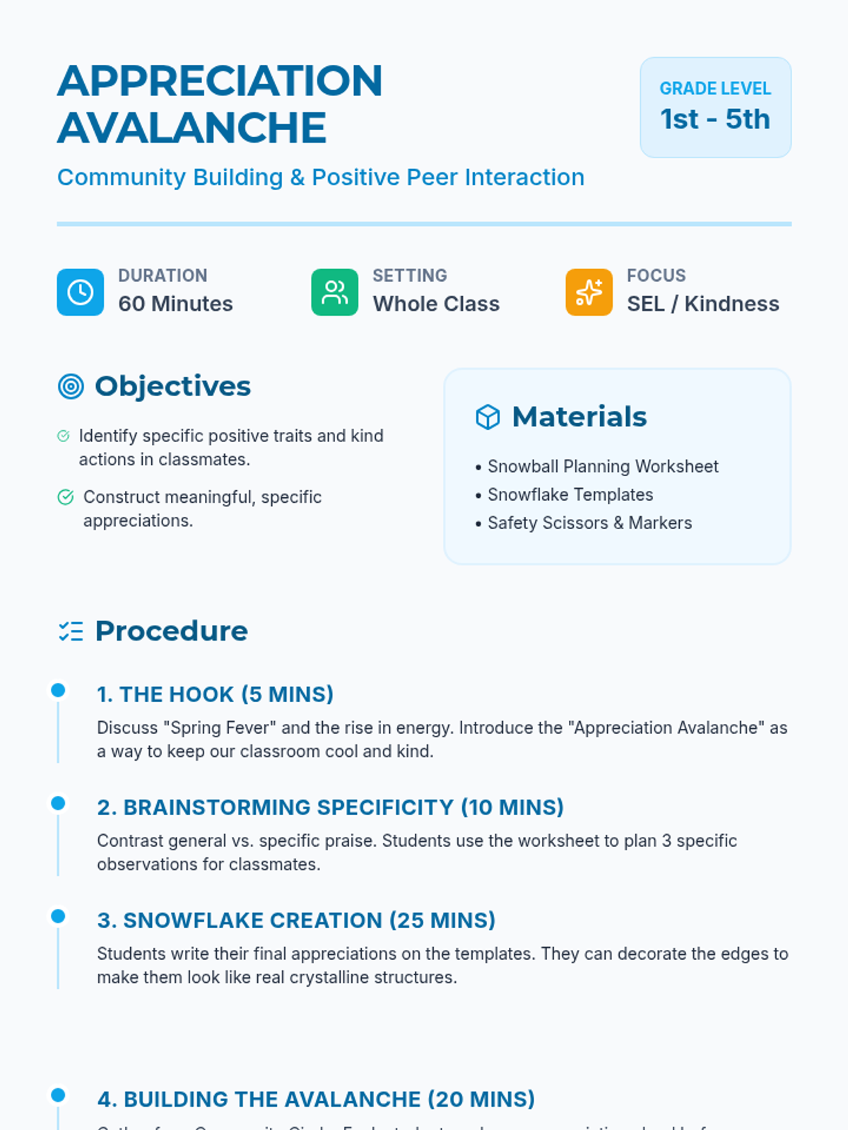 A comprehensive teacher's guide for the 'Appreciation Avalanche' lesson, featuring learning objectives, step-by-step procedures, and differentiation strategies for grades 1-5.