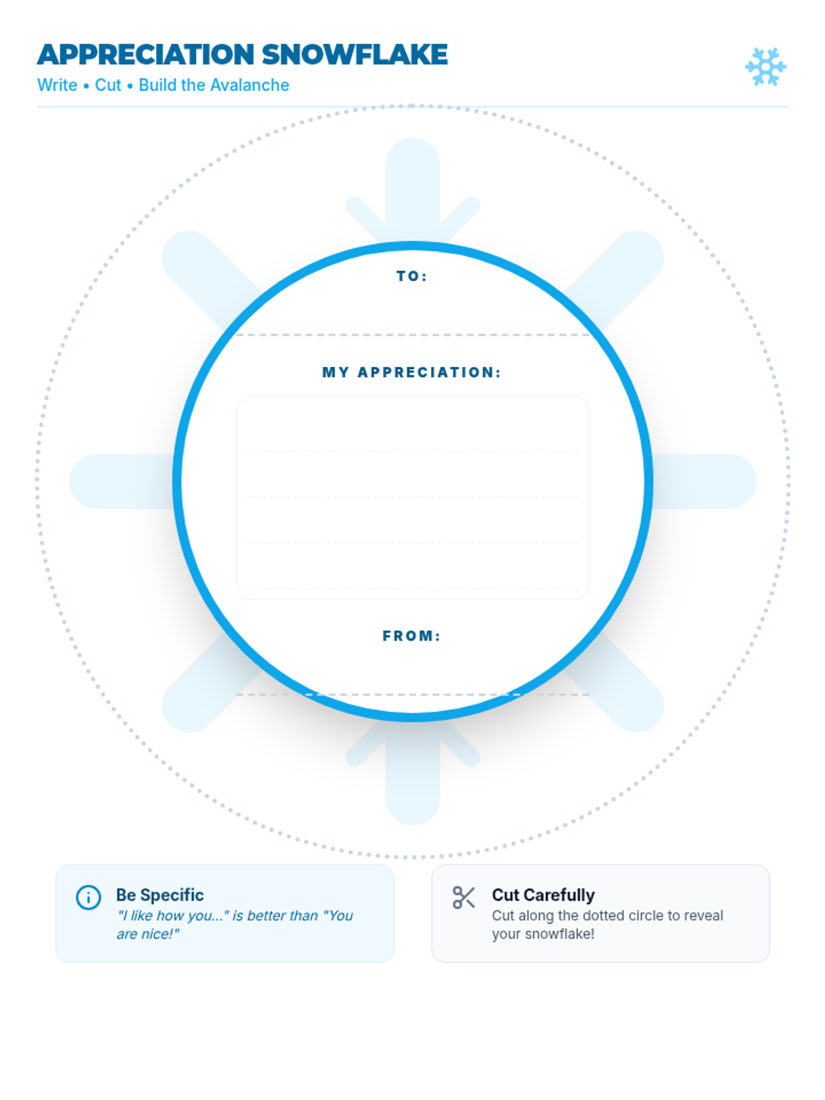 A printable snowflake template for students to write their specific appreciations, designed with a large center writing area and 'arms' for decoration.