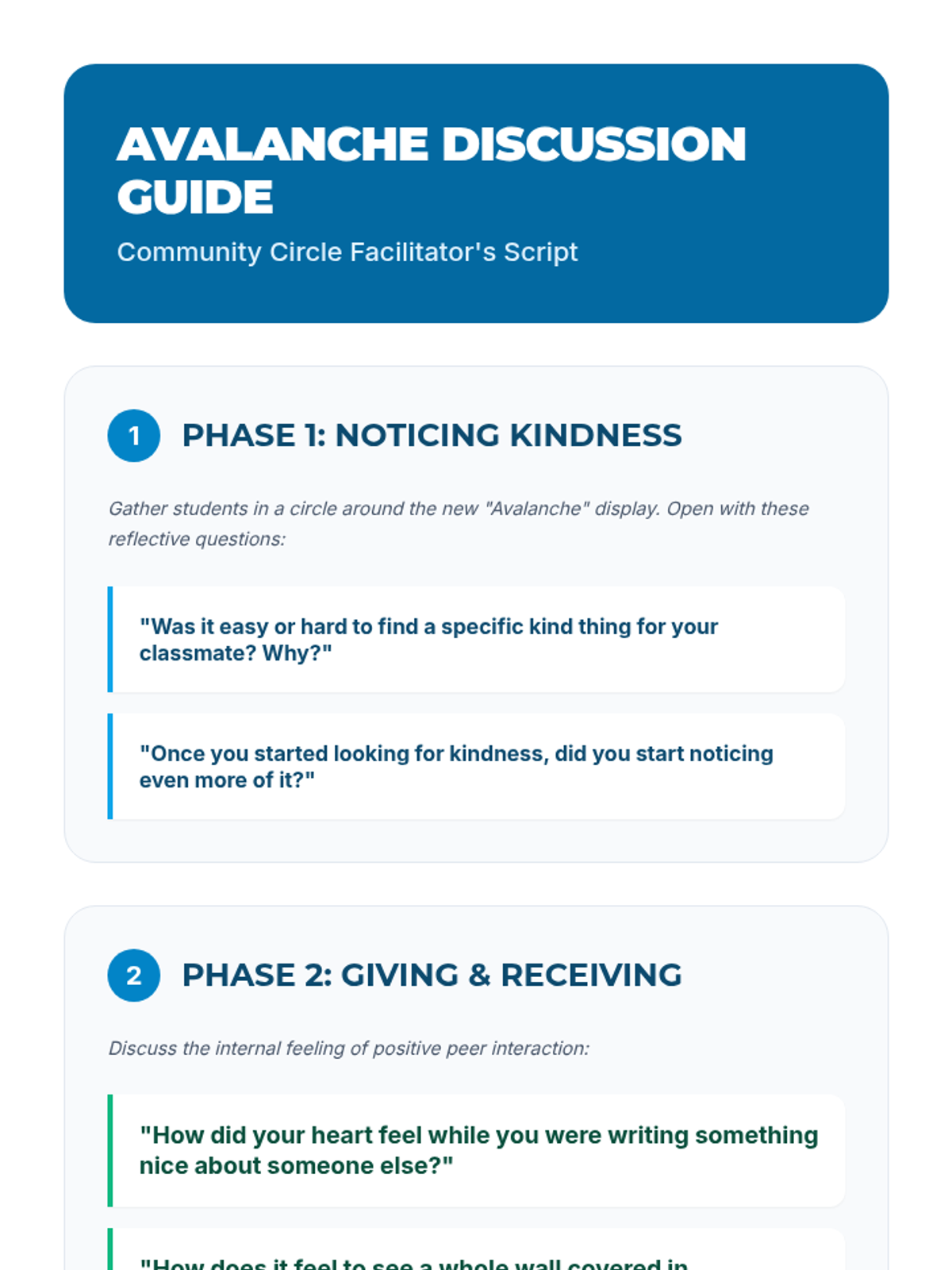 A comprehensive facilitation guide for the Appreciation Avalanche lesson, including objectives, materials, a step-by-step instructional sequence, and deep-dive discussion prompts. Fixed page-breaking and text contrast issues.