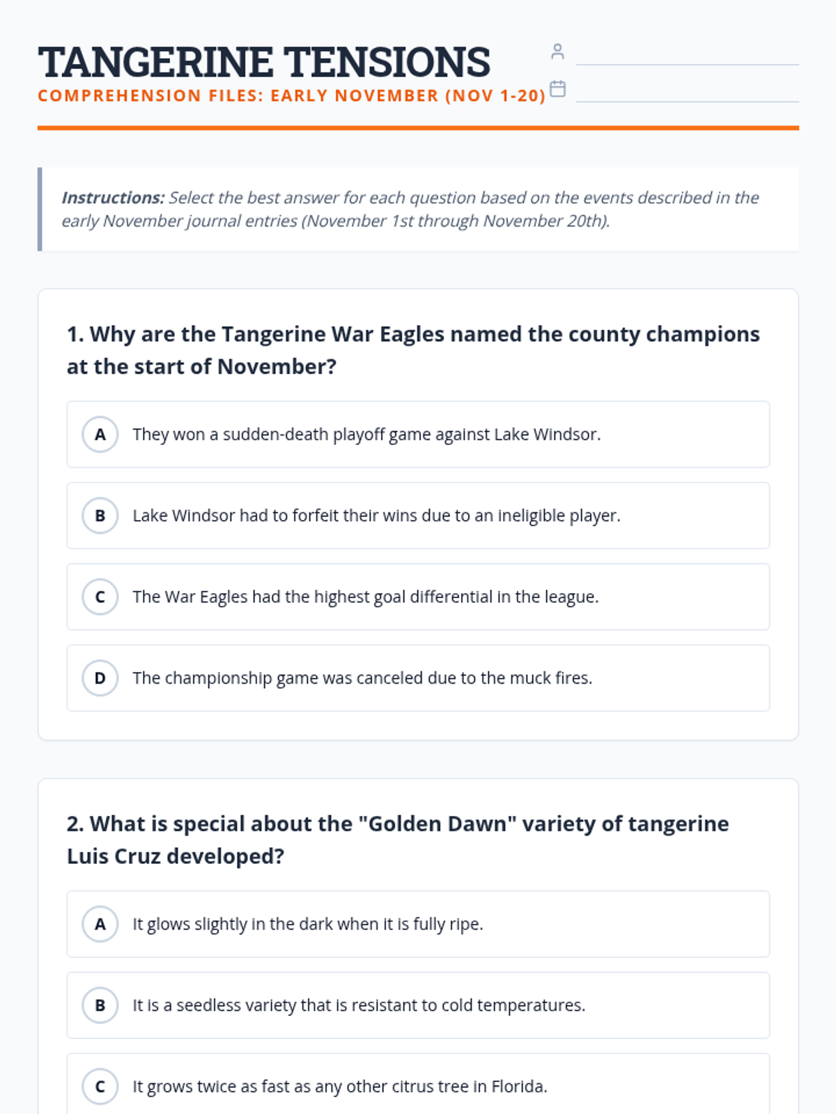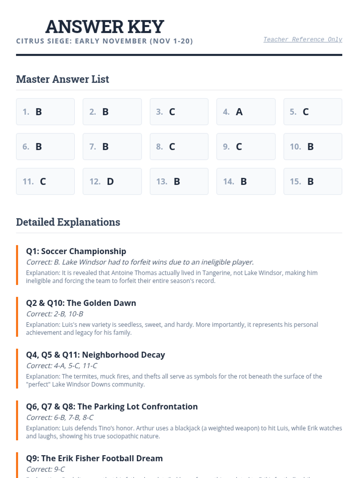 An answer key and teacher guide for the Citrus Siege Quiz, focusing on the early November section (Nov 1-20) of the novel Tangerine.