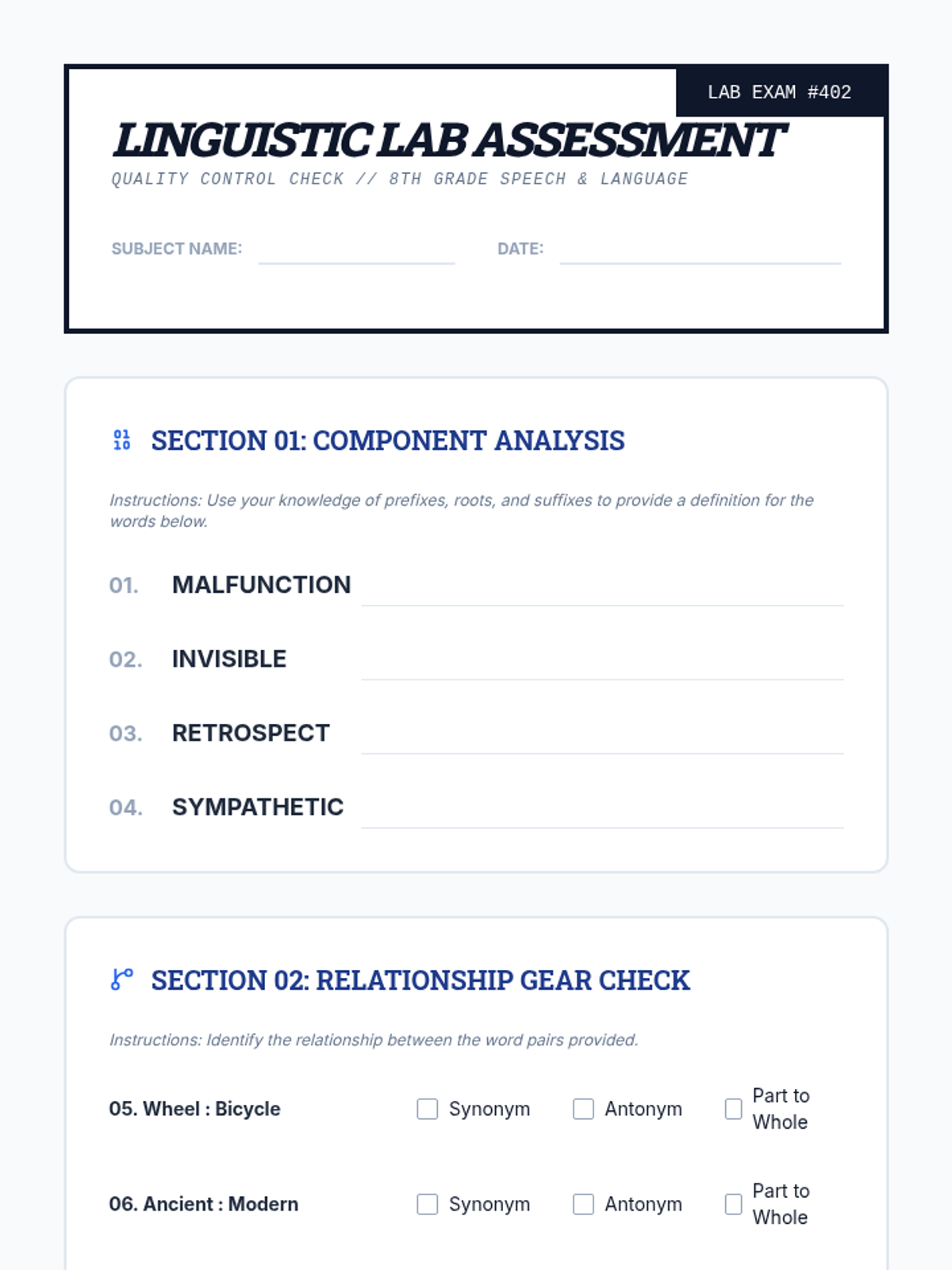 A 1-page assessment quiz titled 'Linguistic Lab Assessment'. It tests students on word morphology (prefixes/roots/suffixes), word relationships (synonym/antonym/part-whole), and identifying parts of speech/function in sentences.