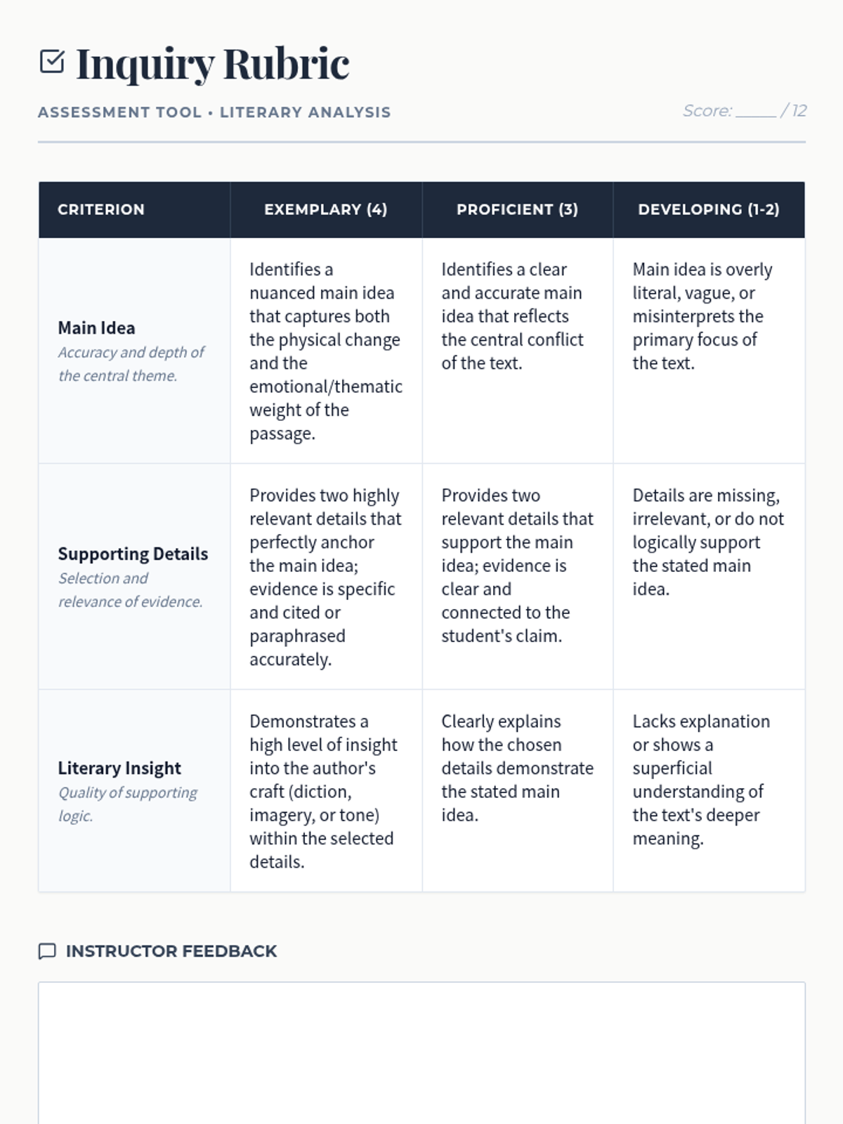A professional assessment rubric for the Inkwell Inquiry worksheet, focusing on main idea identification, evidence selection, and literary insight.
